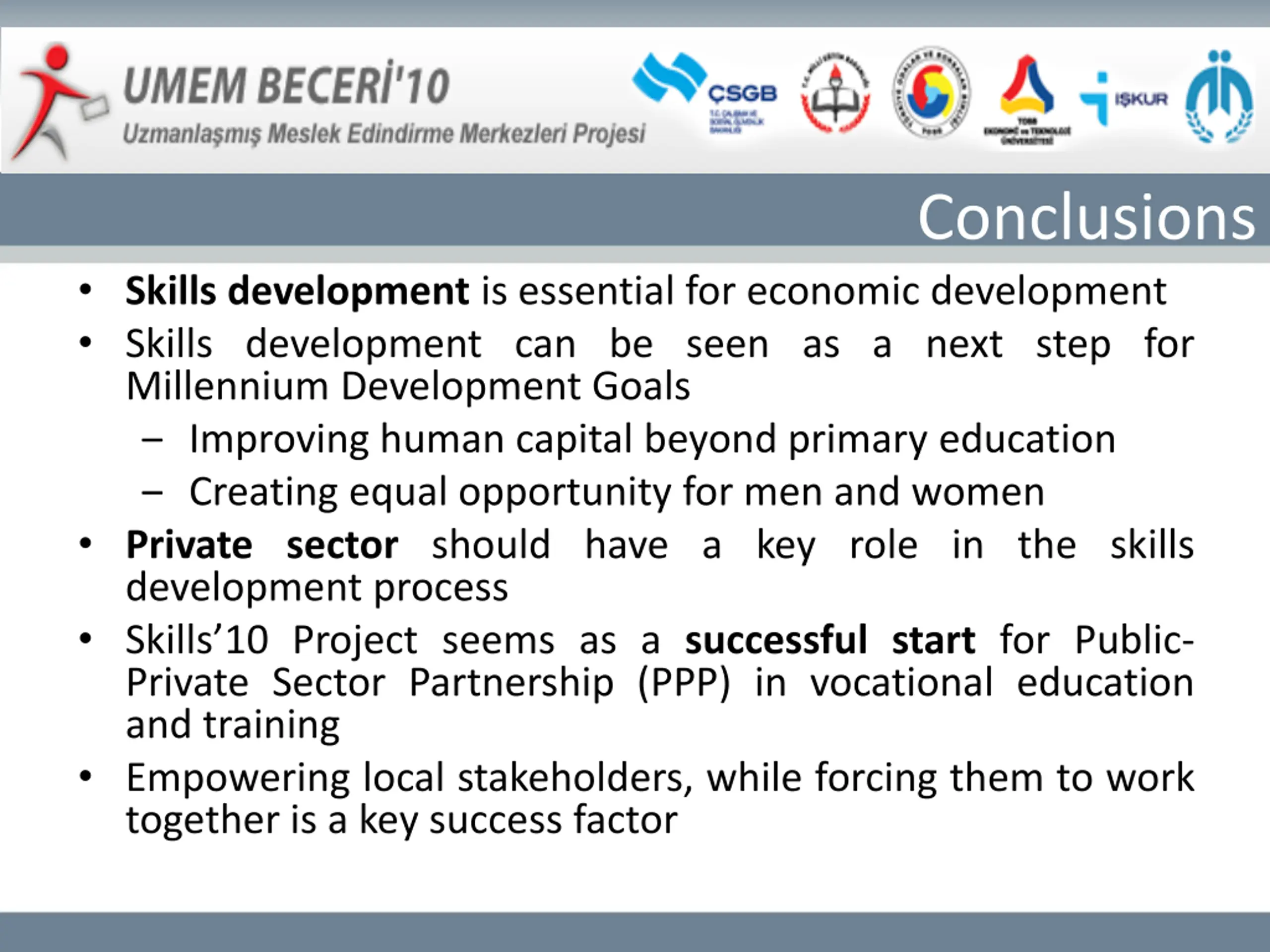 Conclusions Skills development is essential for economic development Skills development can be seen as a next step for Millennium Development Goals Improving human capital beyond primary education Creating equal opportunity for men and women Private sector should have a key role in the skills development process Skills 10 Project seems as a successful start for Public- Private Sector Partnership (PPP) in vocational education and training Empowering local stakeholders, while forcing them to work together is a key success factor