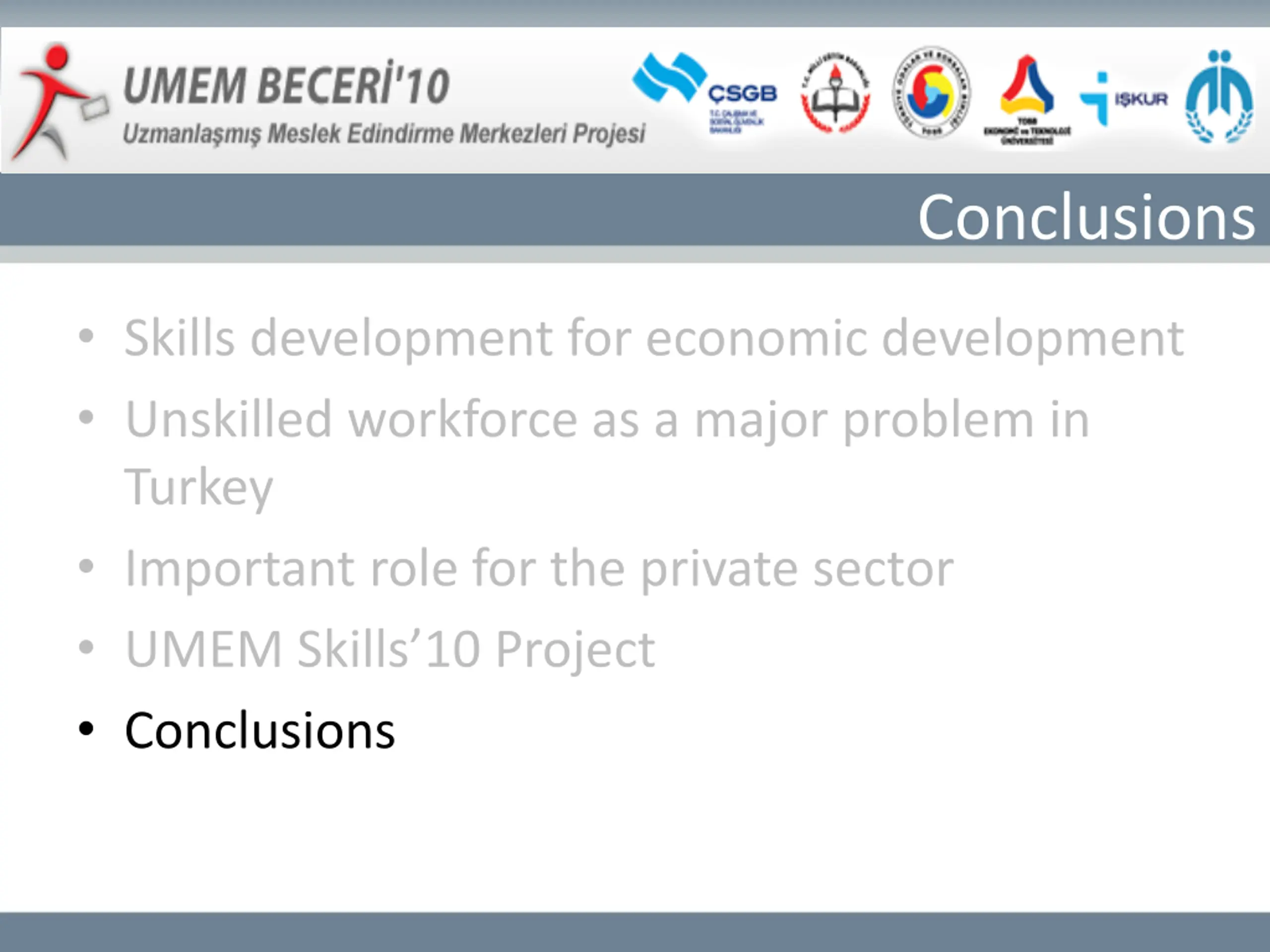 Conclusions Skills development for economic development Unskilled workforce as a major problem in Turkey Important role for the private sector UMEM Skills 10 Project Conclusions
