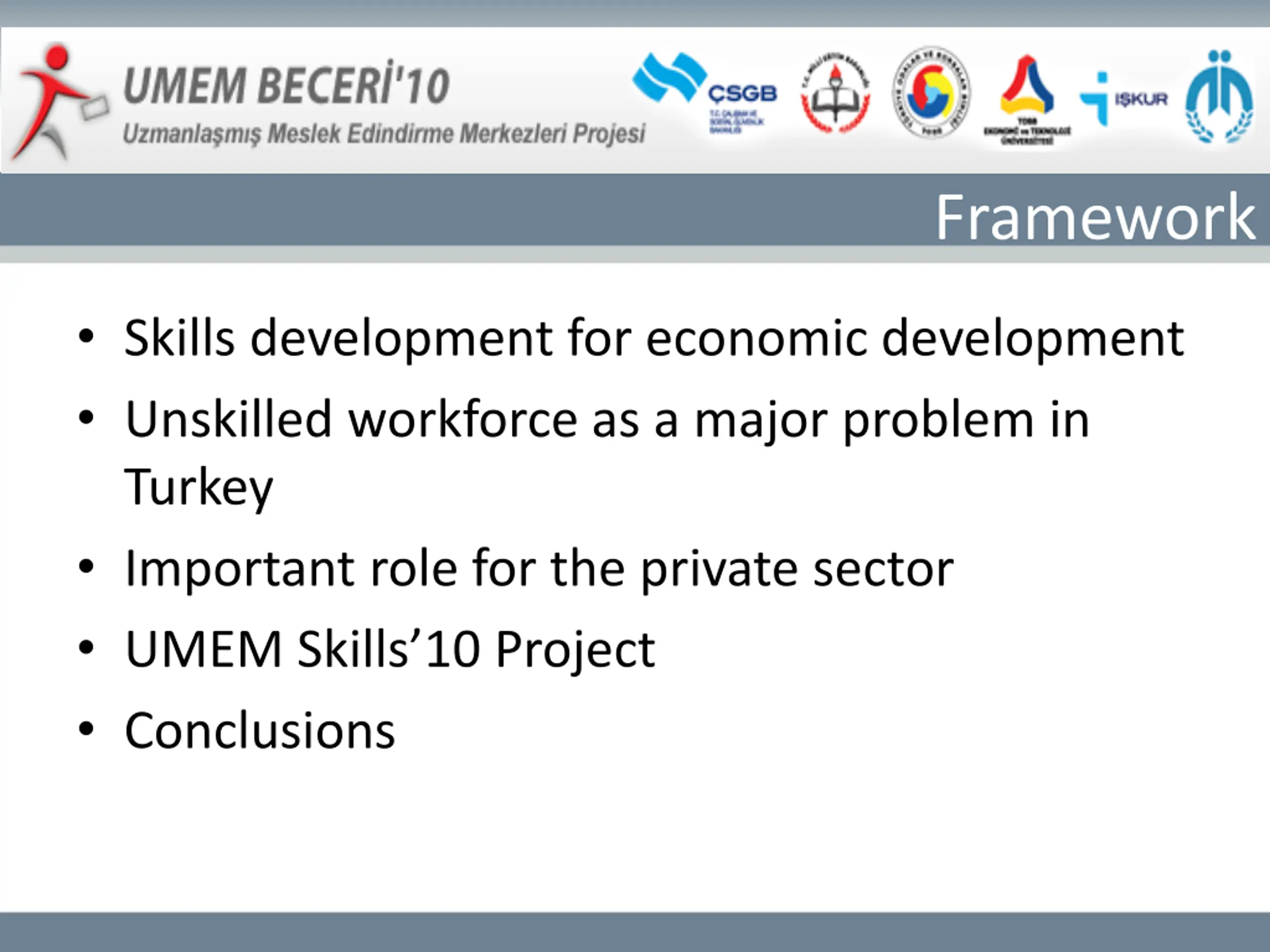 Framework Skills development for economic development Unskilled workforce as a major problem in Turkey Important role for the private sector UMEM Skills 10 Project Conclusions