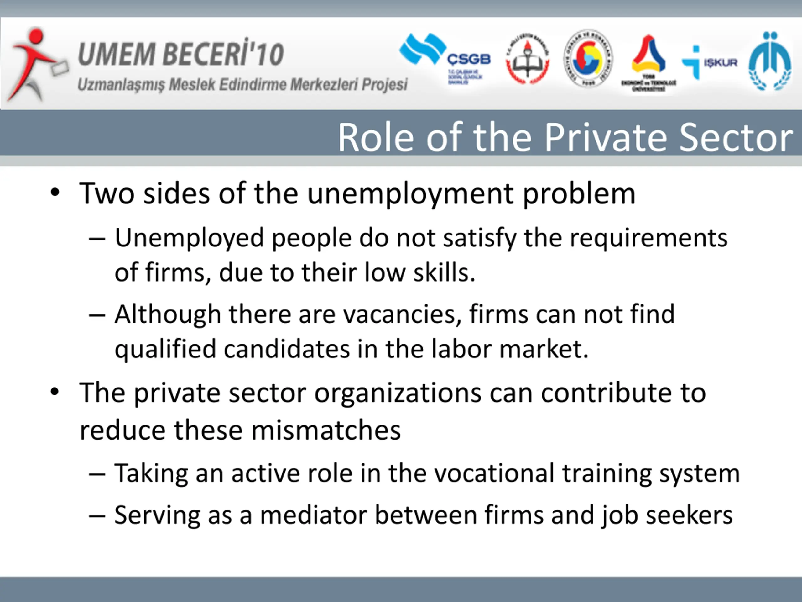Role of the Private Sector Two sides of the unemployment problem Unemployed people do not satisfy the requirements of firms, due to their low skills. Although there are vacancies, firms can not find qualified candidates in the labor market. The private sector organizations can contribute to reduce these mismatches Taking an active role in the vocational training system Serving as a mediator between firms and job seekers