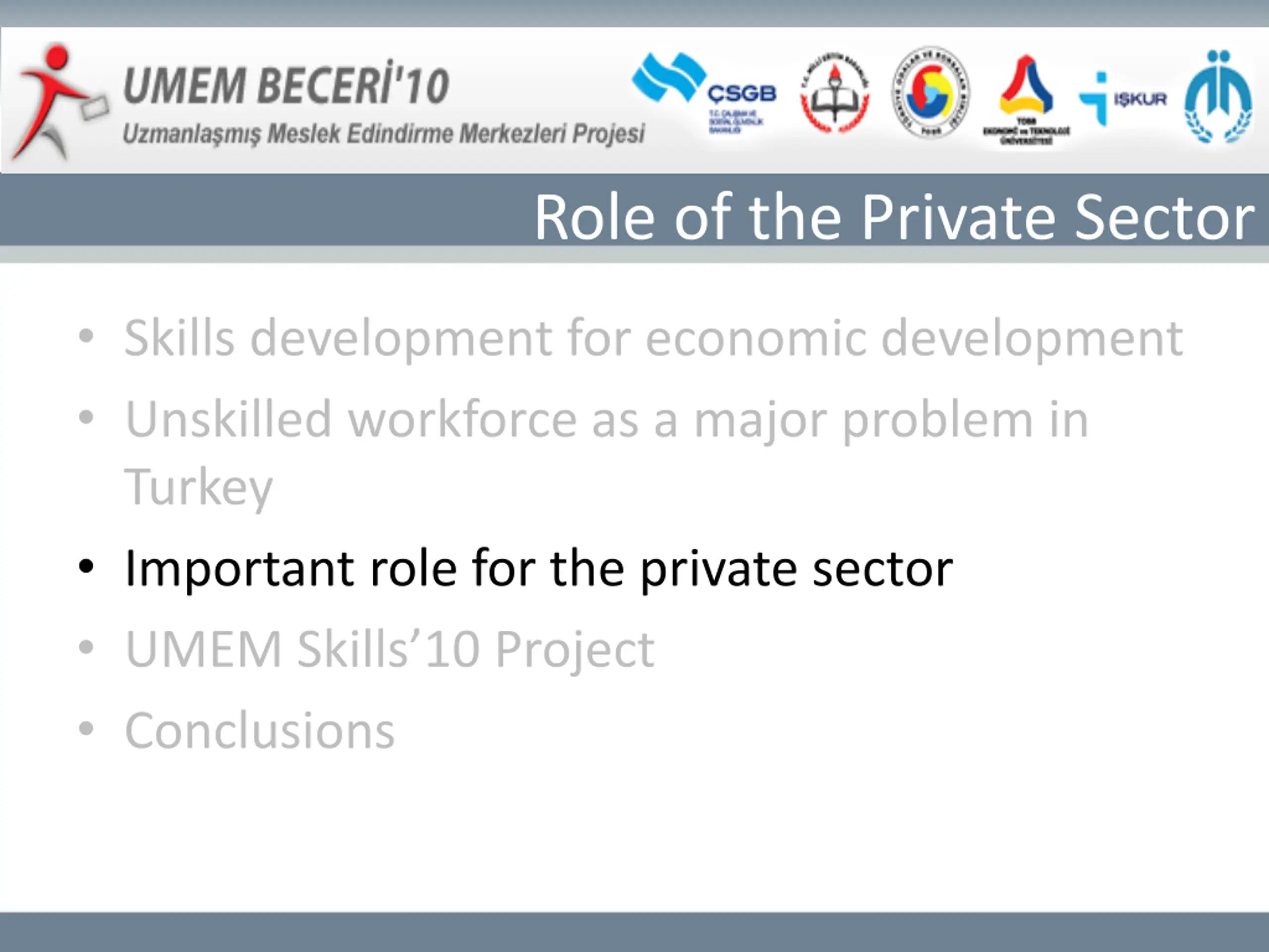 Role of the Private Sector Skills development for economic development Unskilled workforce as a major problem in Turkey Important role for the private sector UMEM Skills 10 Project Conclusions
