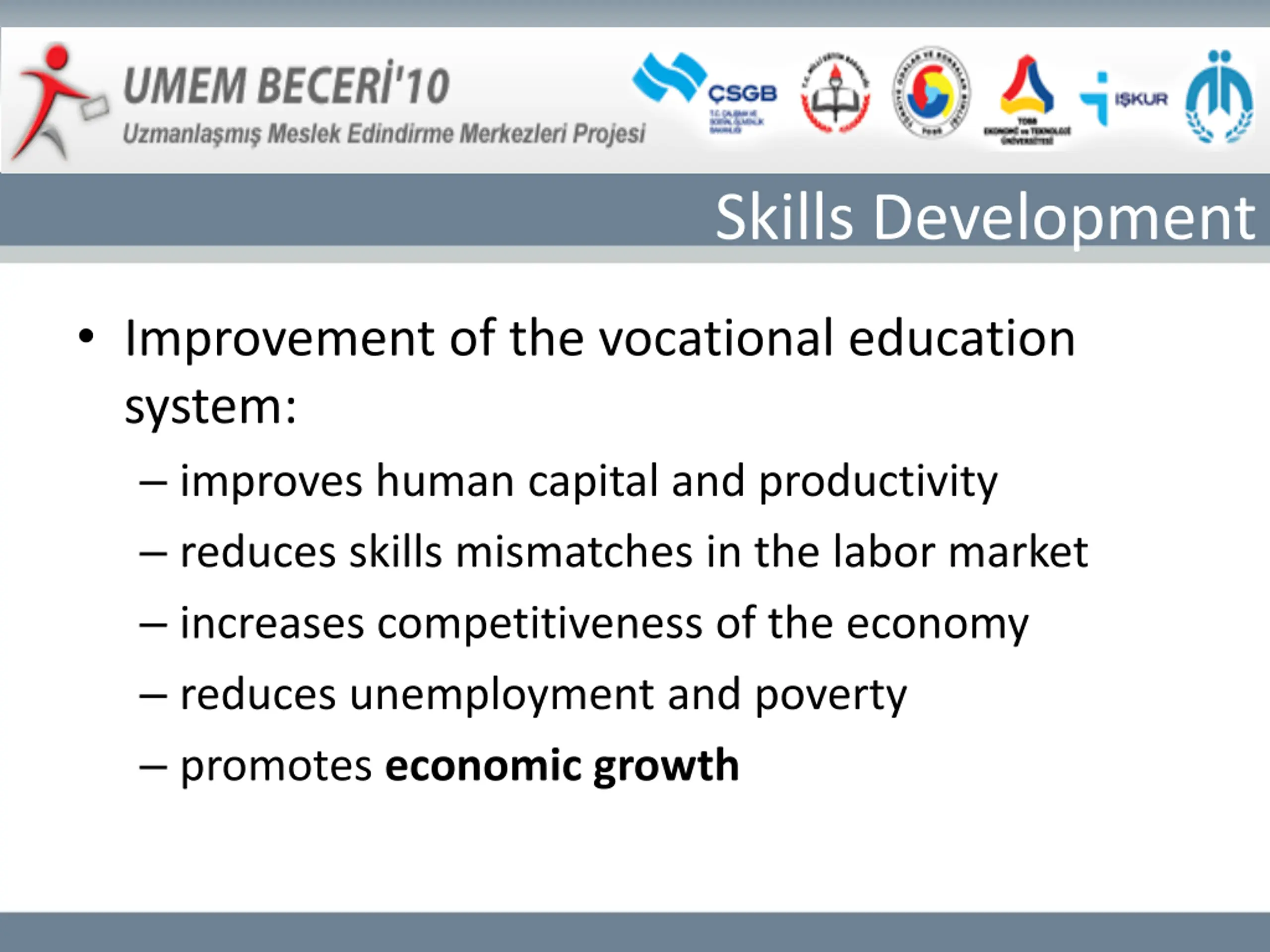 Skills Development Improvement of the vocational education system: improves human capital and productivity reduces skills mismatches in the labor market increases competitiveness of the economy reduces unemployment and poverty promotes economic growth
