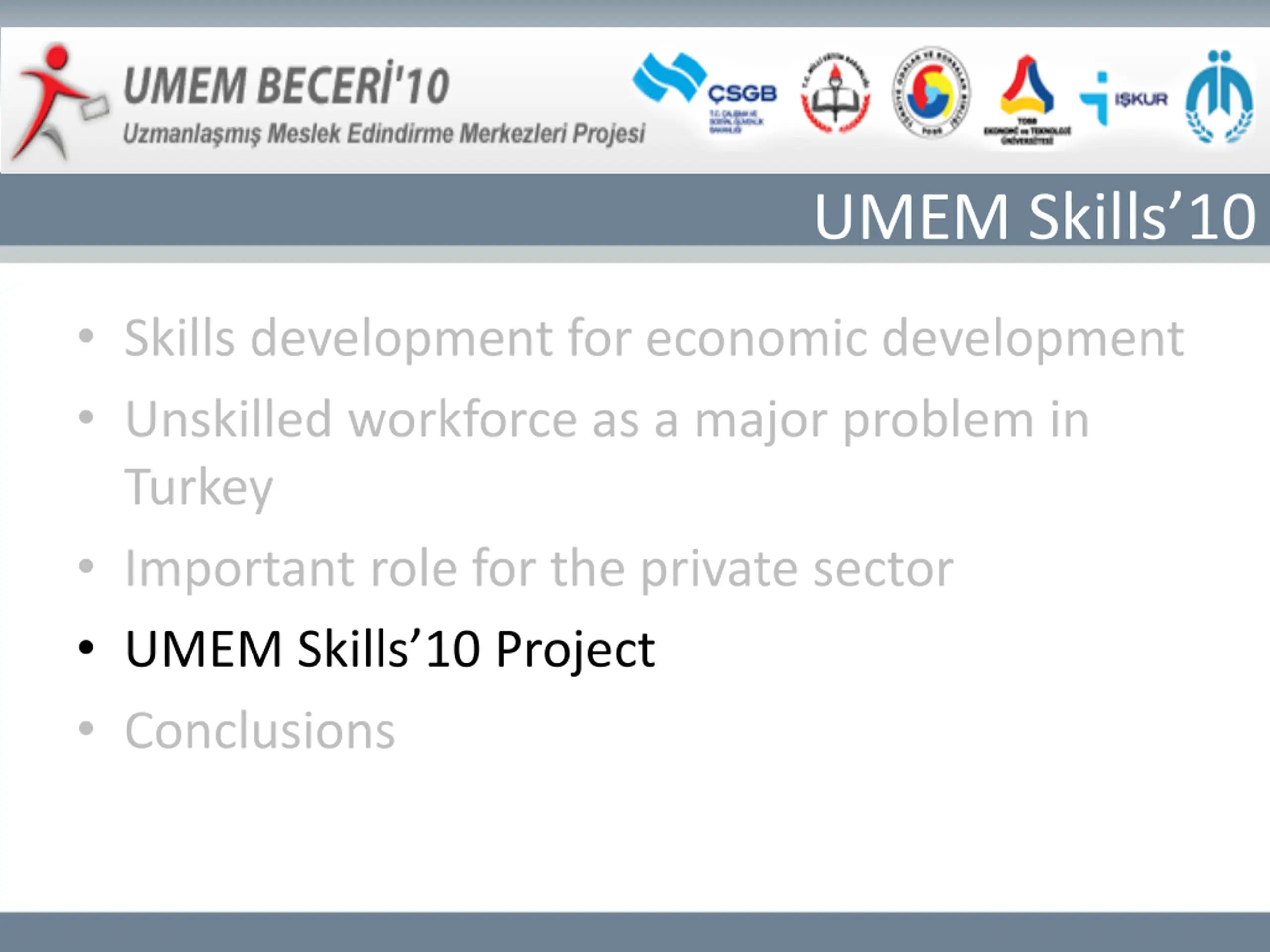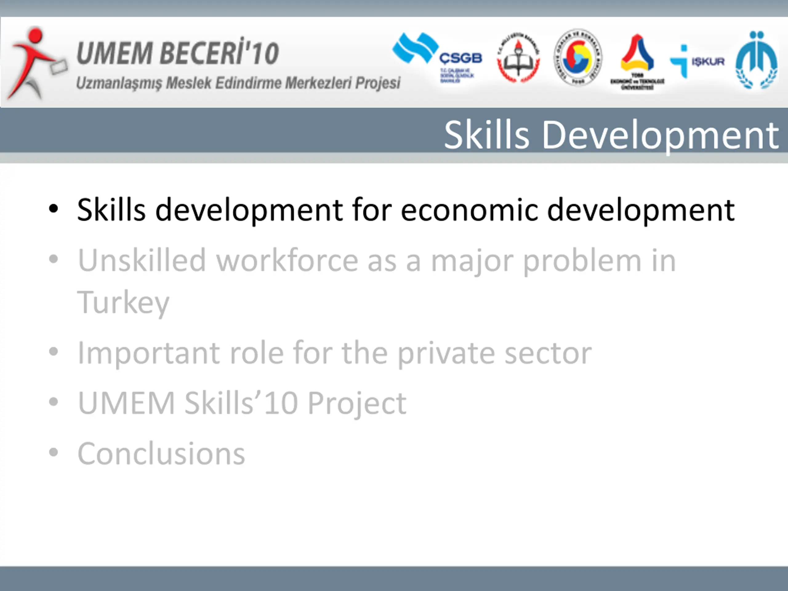 Skills Development Skills development for economic development Unskilled workforce as a major problem in Turkey Important role for the private sector UMEM Skills 10 Project Conclusions
