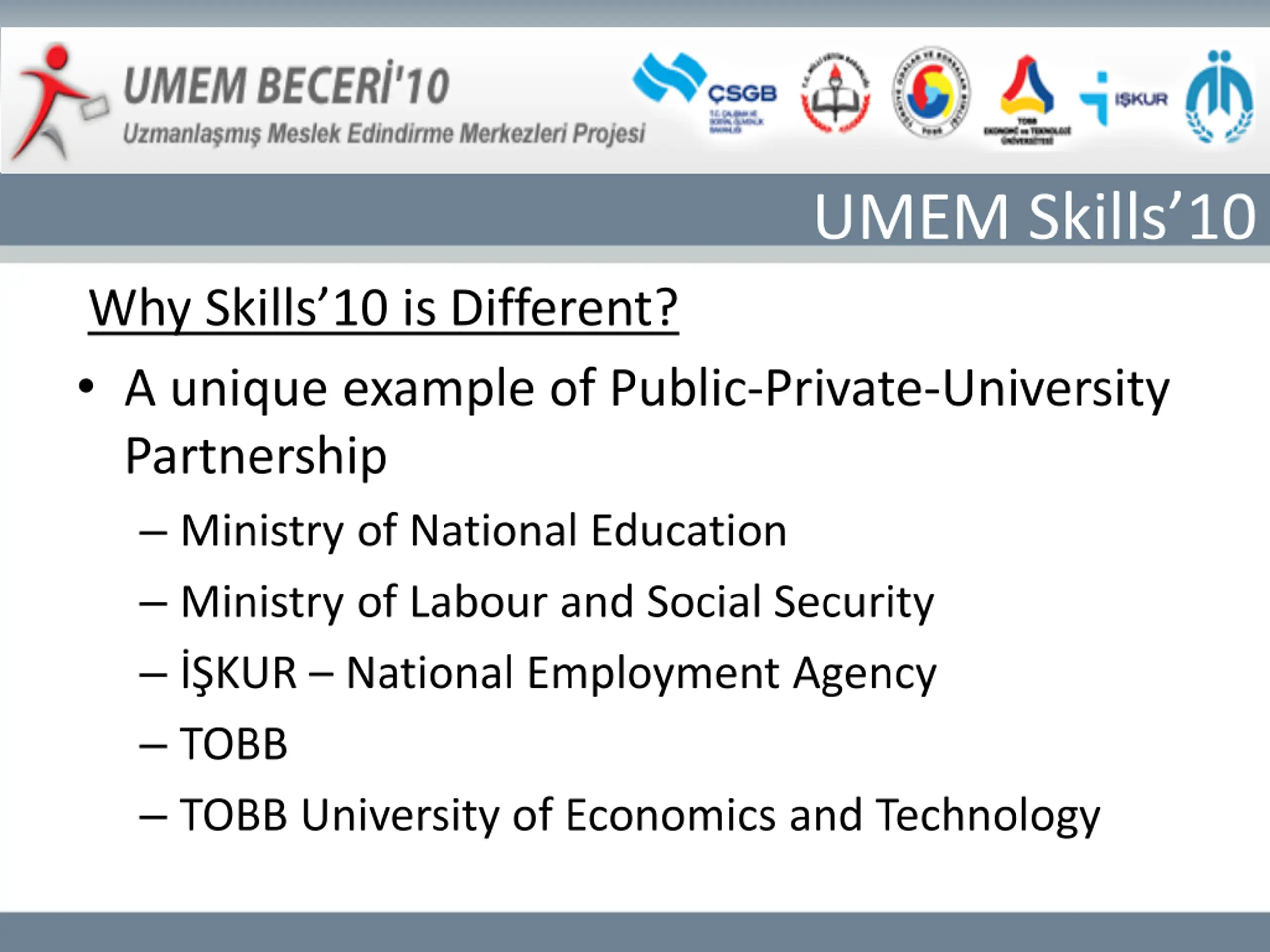 UMEM Skills10 Why Skills 10 is Different? A unique example of Public-Private-University Partnership Ministry of National Education Ministry of Labour and Social Security KUR National Employment Agency TOBB TOBB University of Economics and Technology