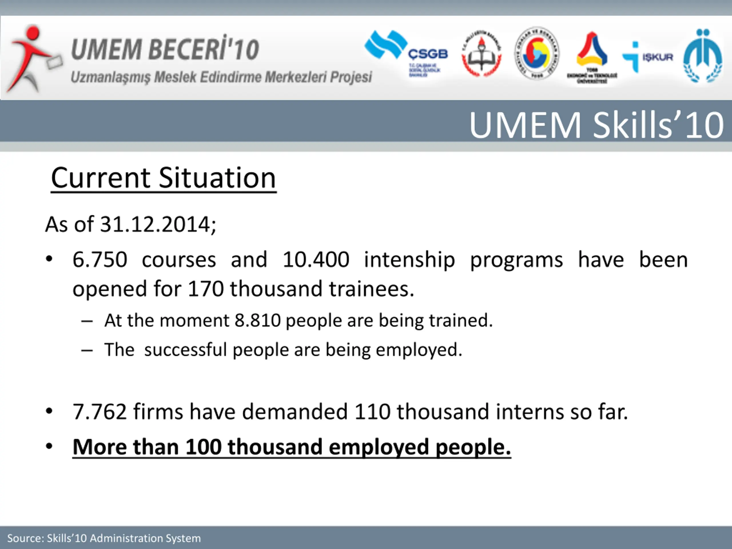 UMEM Skills10 Current Situation As of 31.12.2014; 6.750 courses and 10.400 intenship programs have been opened for 170 thousand trainees. At the moment 8.810 people are being trained. The successful people are being employed. 7.762 firms have demanded 110 thousand interns so far. More than 100 thousand employed people. Source: Skills 10 Administration System