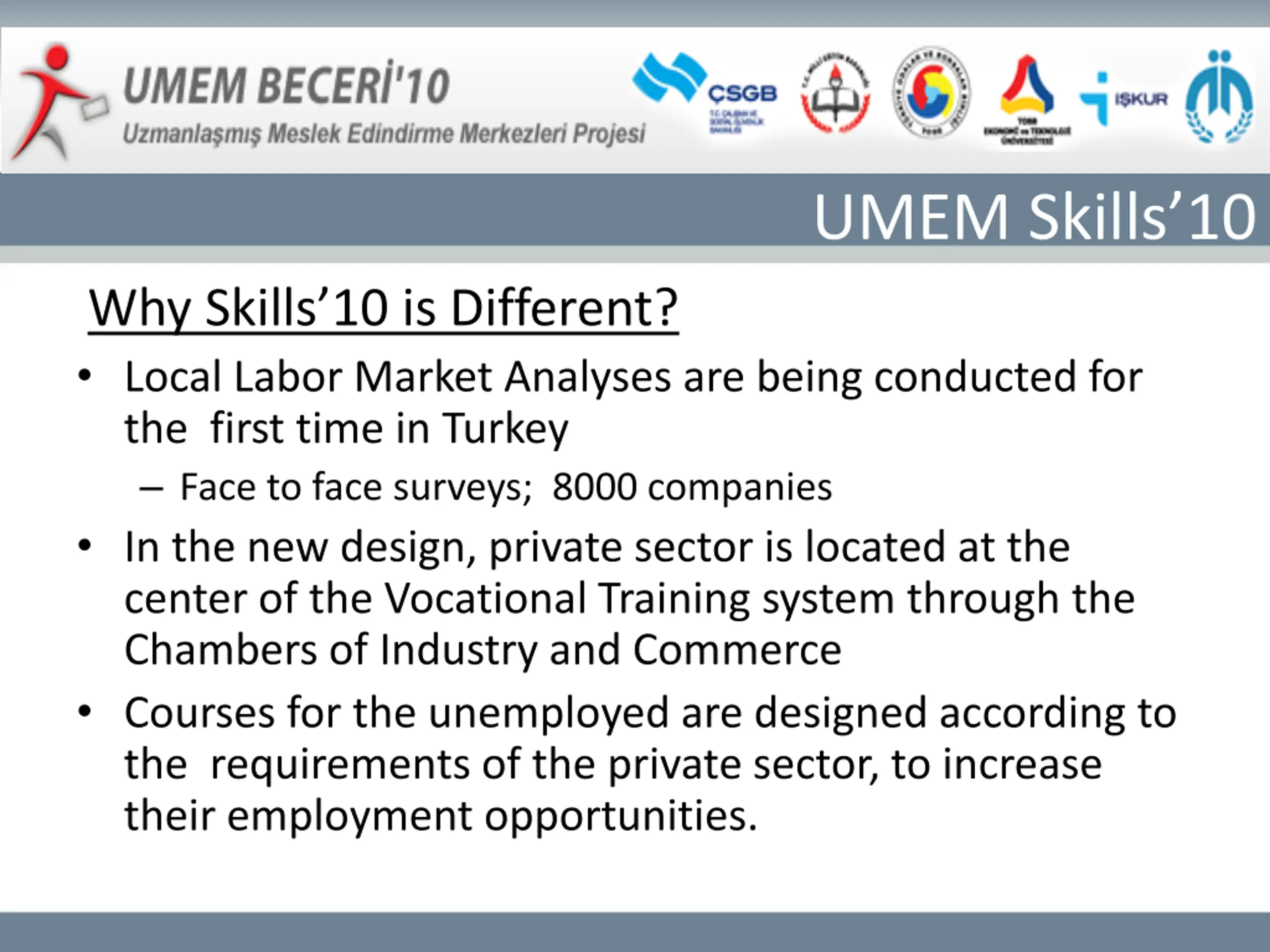 UMEM Skills10 Why Skills 10 is Different? Local Labor Market Analyses are being conducted for the first time in Turkey Face to face surveys; 8000 companies In the new design, private sector is located at the center of the Vocational Training system through the Chambers of Industry and Commerce Courses for the unemployed are designed according to the requirements of the private sector, to increase their employment opportunities.