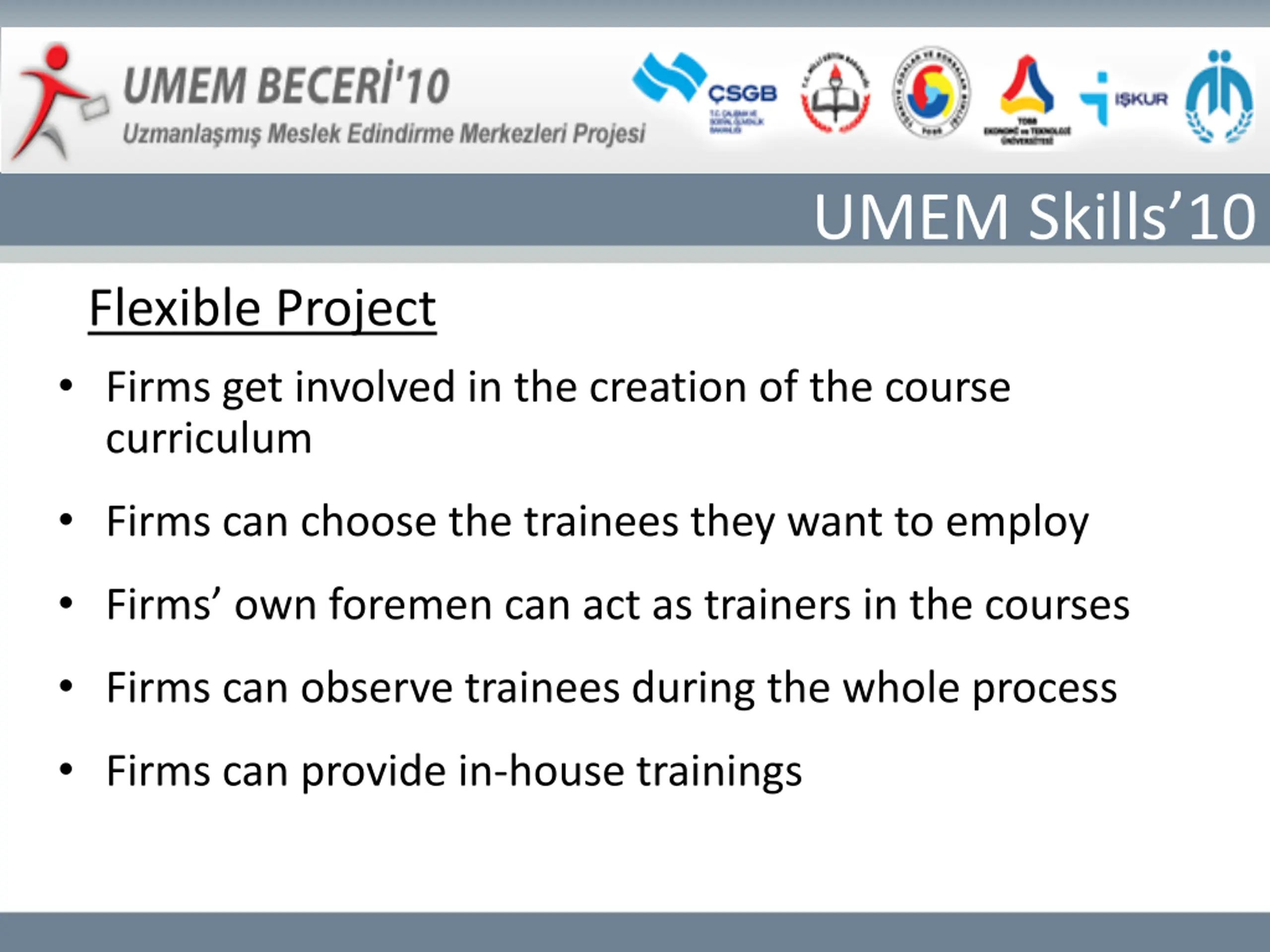 UMEM Skills10 Flexible Project Firms get involved in the creation of the course curriculum Firms can choose the trainees they want to employ Firms own foremen can act as trainers in the courses Firms can observe trainees during the whole process Firms can provide in-house trainings