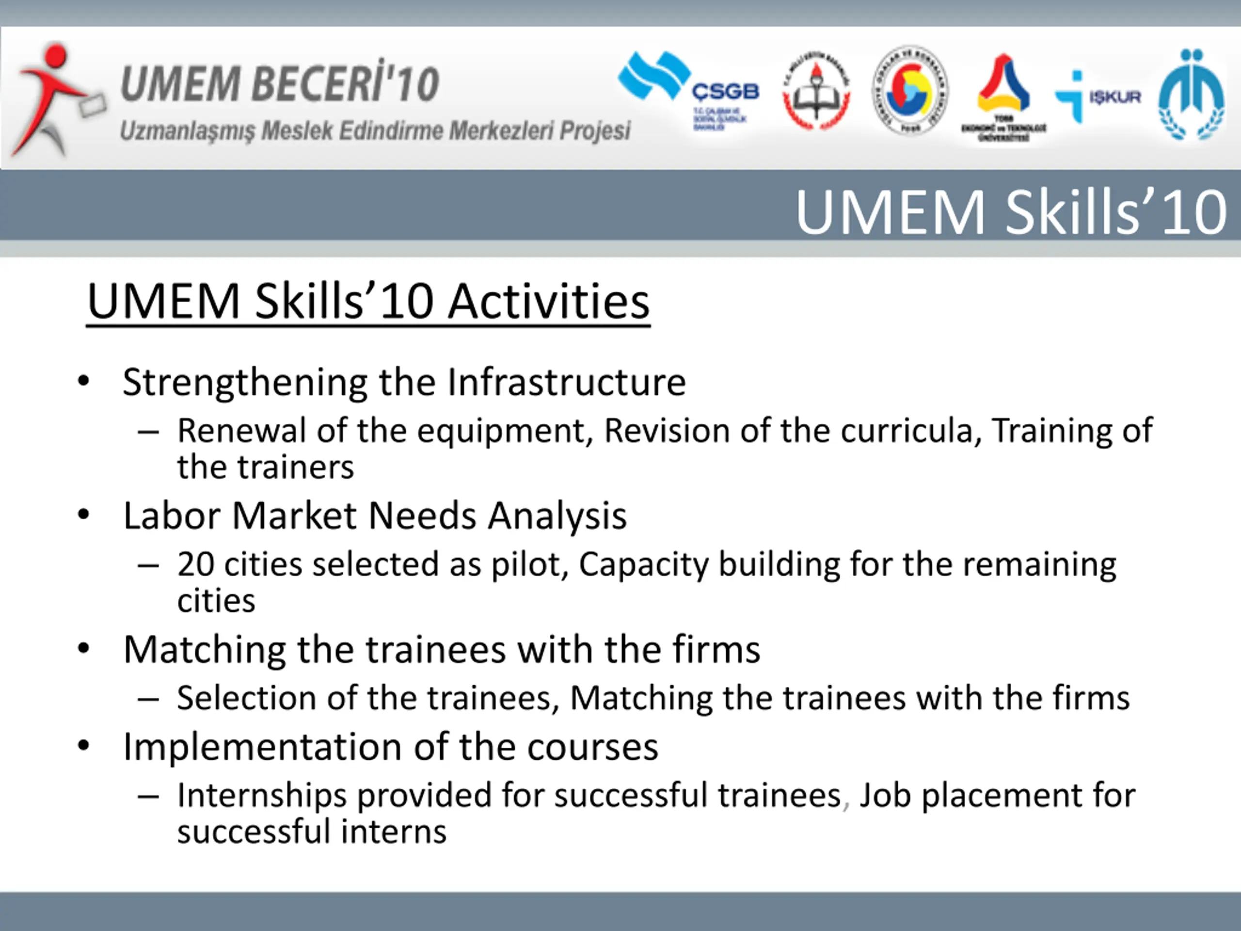 UMEM Skills10 UMEM Skills 10 Activities Strengthening the Infrastructure Renewal of the equipment, Revision of the curricula, Training of the trainers Labor Market Needs Analysis 20 cities selected as pilot, Capacity building for the remaining cities Matching the trainees with the firms Selection of the trainees, Matching the trainees with the firms Implementation of the courses Internships provided for successful trainees, Job placement for successful interns