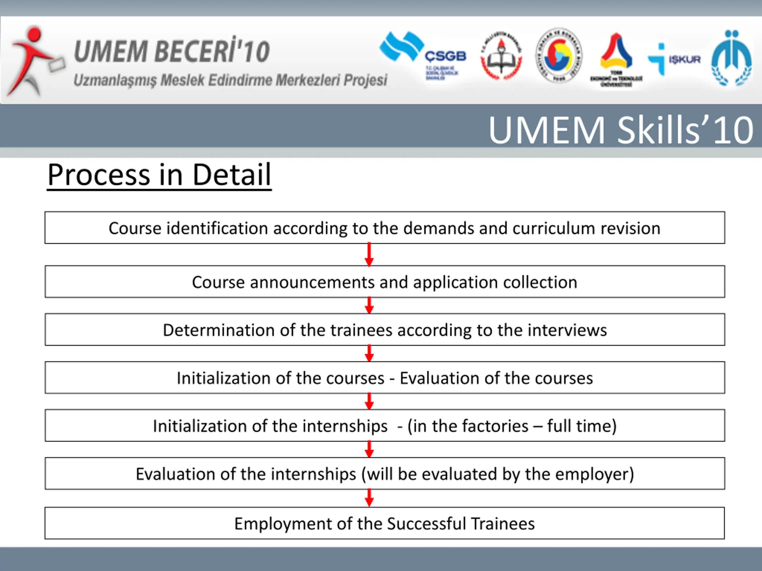 UMEM Skills10 Process in Detail Course identification according to the demands and curriculum revision Course announcements and application collection Determination of the trainees according to the interviews Initialization of the courses - Evaluation of the courses Initialization of the internships - (in the factories full time) Evaluation of the internships (will be evaluated by the employer) Employment of the Successful Trainees