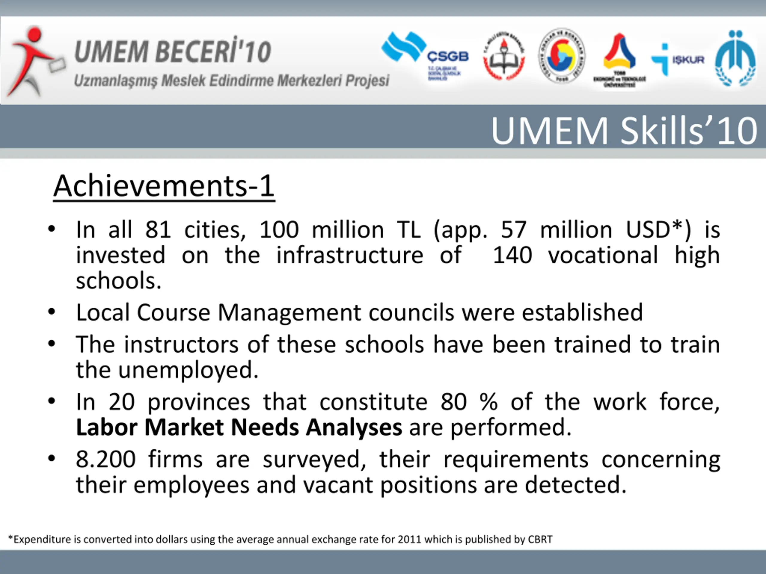 UMEM Skills10 Achievements-1 In all 81 cities, 100 million TL (app. 57 million USD*) is invested on the infrastructure of schools. Local Course Management councils were established The instructors of these schools have been trained to train the unemployed. In 20 provinces that constitute 80 % of the work force, Labor Market Needs Analyses are performed. 8.200 firms are surveyed, their requirements concerning their employees and vacant positions are detected. 140 vocational high *Expenditure is converted into dollars using the average annual exchange rate for 2011 which is published by CBRT