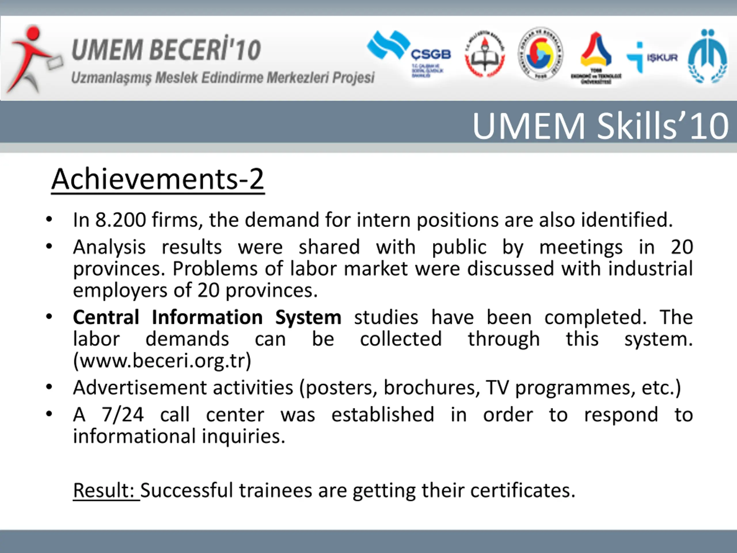 UMEM Skills10 Achievements-2 In 8.200 firms, the demand for intern positions are also identified. Analysis results were shared with public by meetings in 20 provinces. Problems of labor market were discussed with industrial employers of 20 provinces. Central Information System studies have been completed. The labor demands can be collected (www.beceri.org.tr) Advertisement activities (posters, brochures, TV programmes, etc.) A 7/24 call center was established in order to respond to informational inquiries. through this system. Result: Successful trainees are getting their certificates.