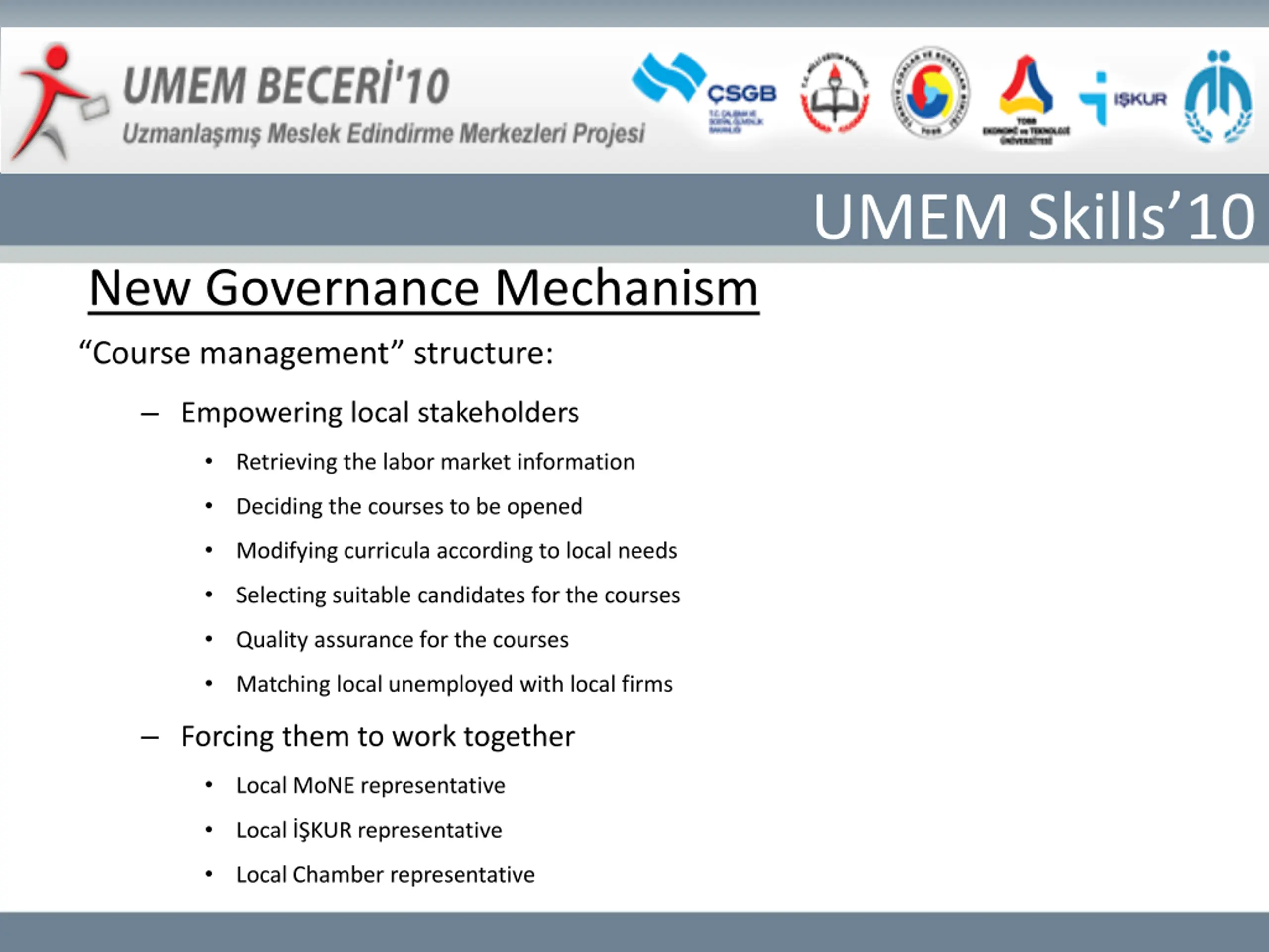 UMEM Skills10 New Governance Mechanism Course management structure: Empowering local stakeholders Retrieving the labor market information Deciding the courses to be opened Modifying curricula according to local needs Selecting suitable candidates for the courses Quality assurance for the courses Matching local unemployed with local firms Forcing them to work together Local MoNE representative Local KUR representative Local Chamber representative