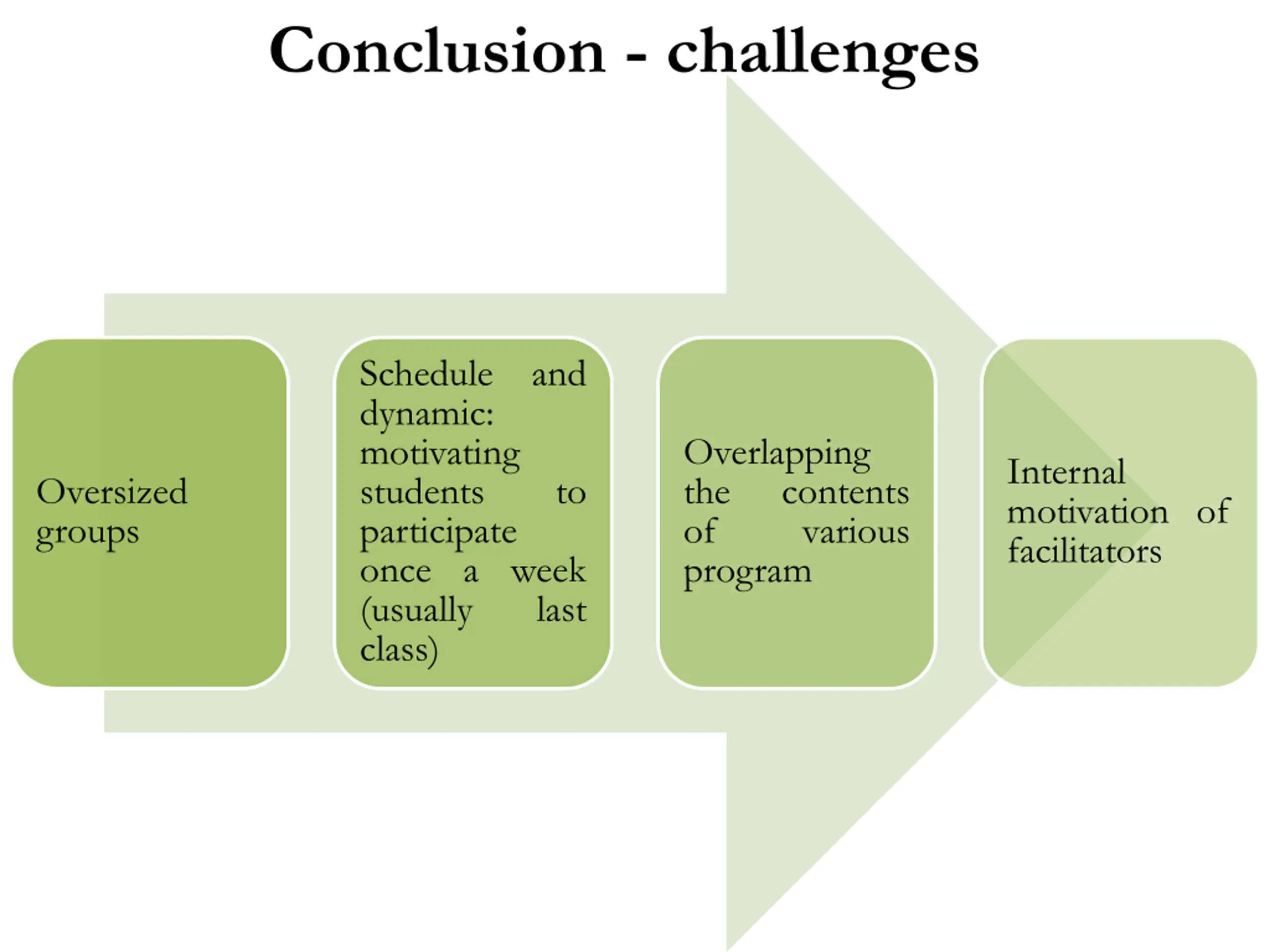 Conclusion - challenges Schedule dynamic: motivating students participate once a week (usually class) and Overlapping the of program Internal motivation of facilitators Oversized groups to contents various last