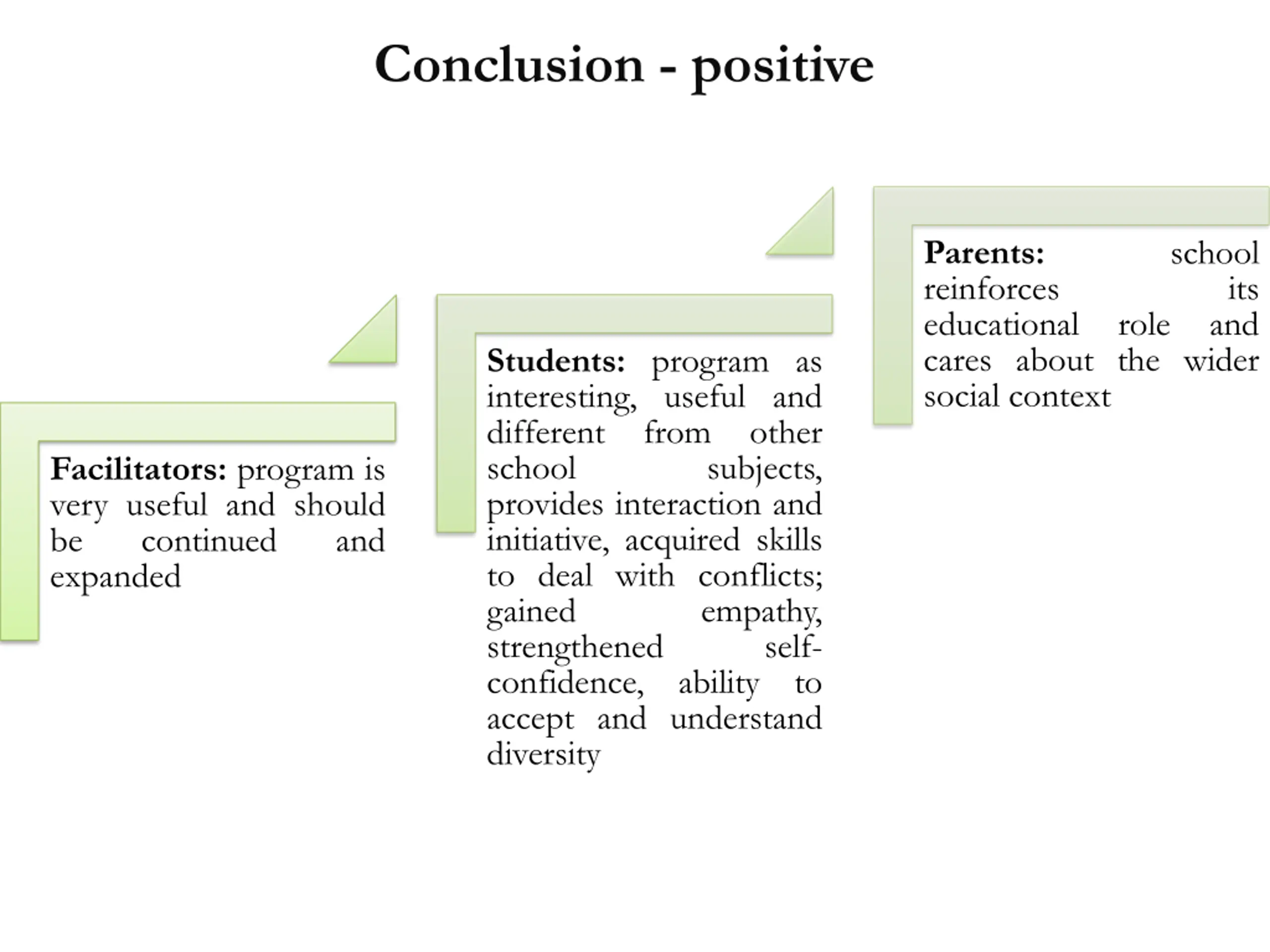 Conclusion - positive Parents: reinforces educational cares about the wider social context school its role and Students: program as interesting, useful and different from school provides interaction and initiative, acquired skills to deal with conflicts; gained strengthened confidence, accept and understand diversity other subjects, Facilitators: program is very useful and should be continued expanded and empathy, self- ability to