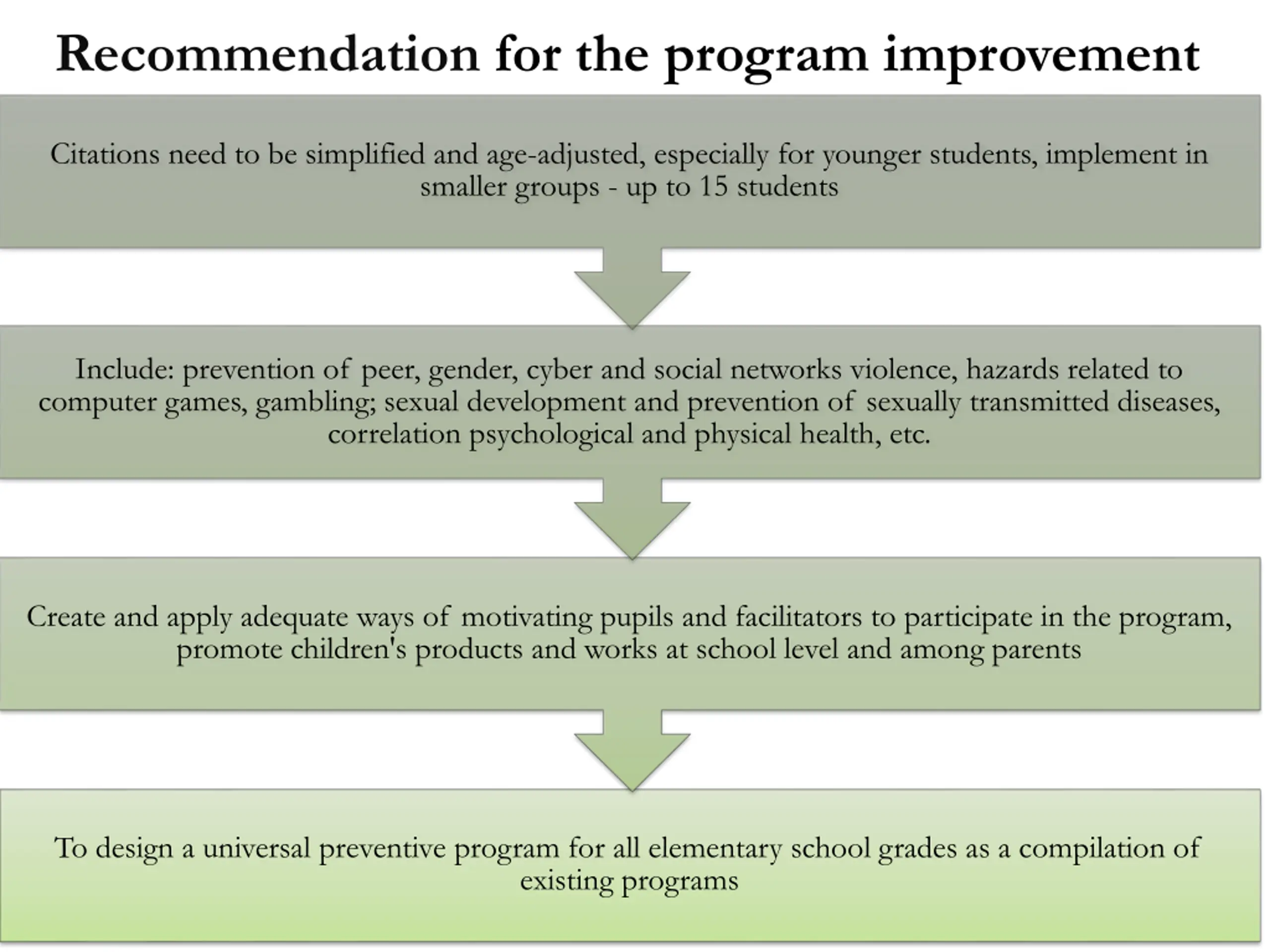 Recommendation for the program improvement Citations need to be simplified and age-adjusted, especially for younger students, implement in smaller groups - up to 15 students Include: prevention of peer, gender, cyber and social networks violence, hazards related to computer games, gambling; sexual development and prevention of sexually transmitted diseases, correlation psychological and physical health, etc. Create and apply adequate ways of motivating pupils and facilitators to participate in the program, promote children's products and works at school level and among parents To design a universal preventive program for all elementary school grades as a compilation of existing programs