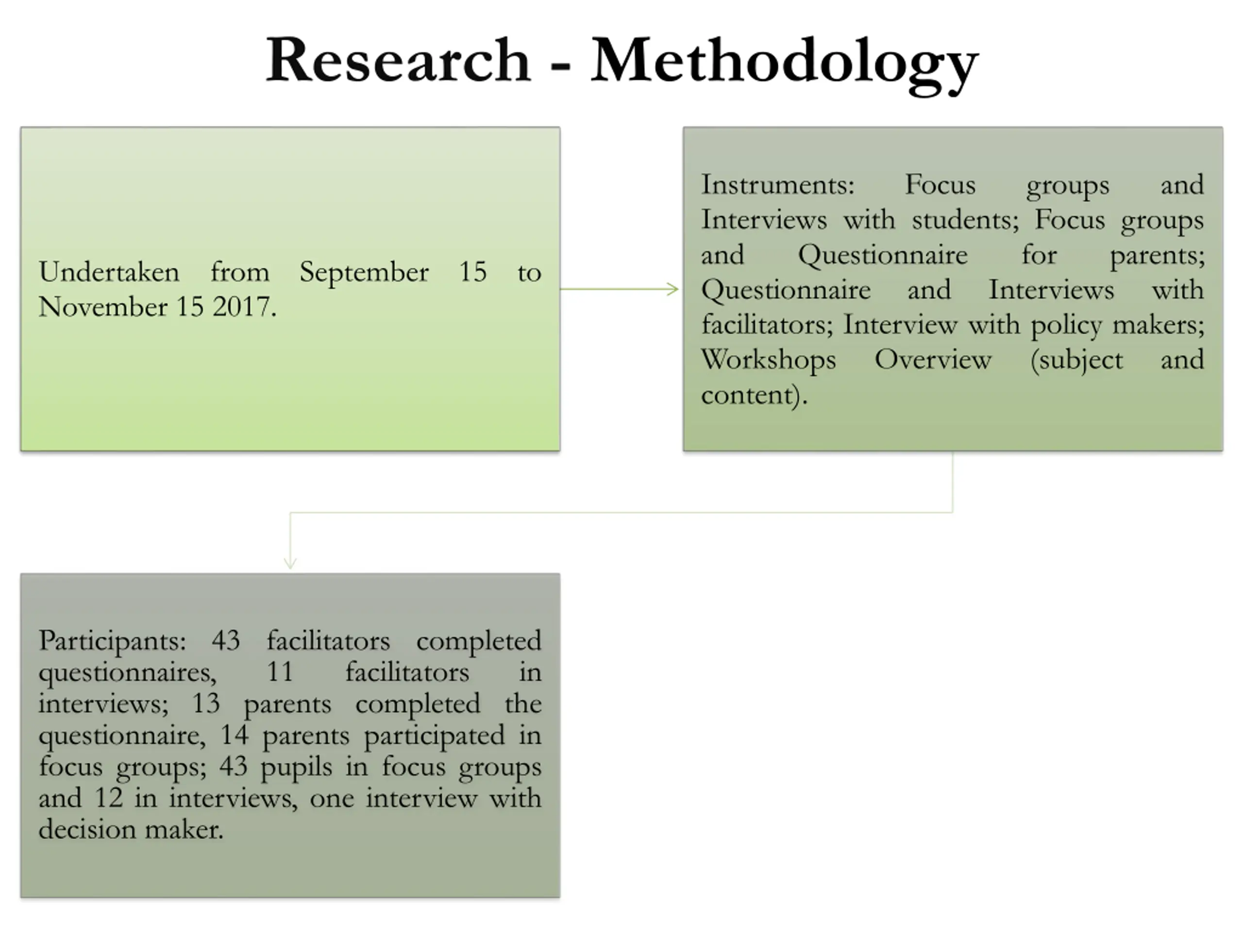 Research - Methodology Instruments: Interviews with students; Focus groups and Questionnaire Questionnaire and facilitators; Interview with policy makers; Workshops Overview content). Focus groups and for parents; with Undertaken November 15 2017. from September 15 to Interviews (subject and Participants: 43 facilitators completed questionnaires, 11 interviews; 13 parents completed the questionnaire, 14 parents participated in focus groups; 43 pupils in focus groups and 12 in interviews, one interview with decision maker. facilitators in