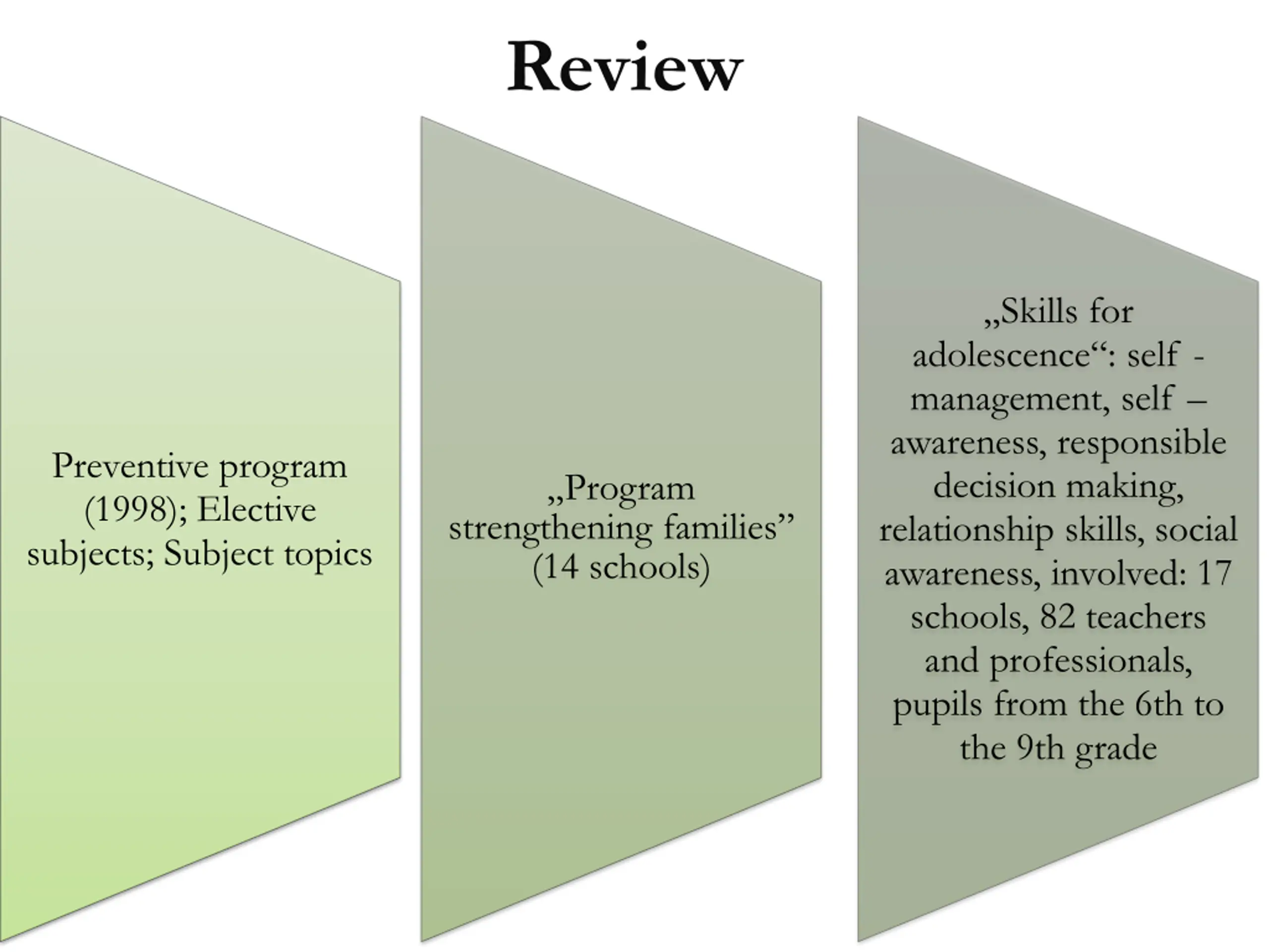 Review Skills for adolescence : self - management, self awareness, responsible decision making, relationship skills, social awareness, involved: 17 schools, 82 teachers and professionals, pupils from the 6th to the 9th grade Preventive program (1998); Elective subjects; Subject topics Program strengthening families (14 schools)
