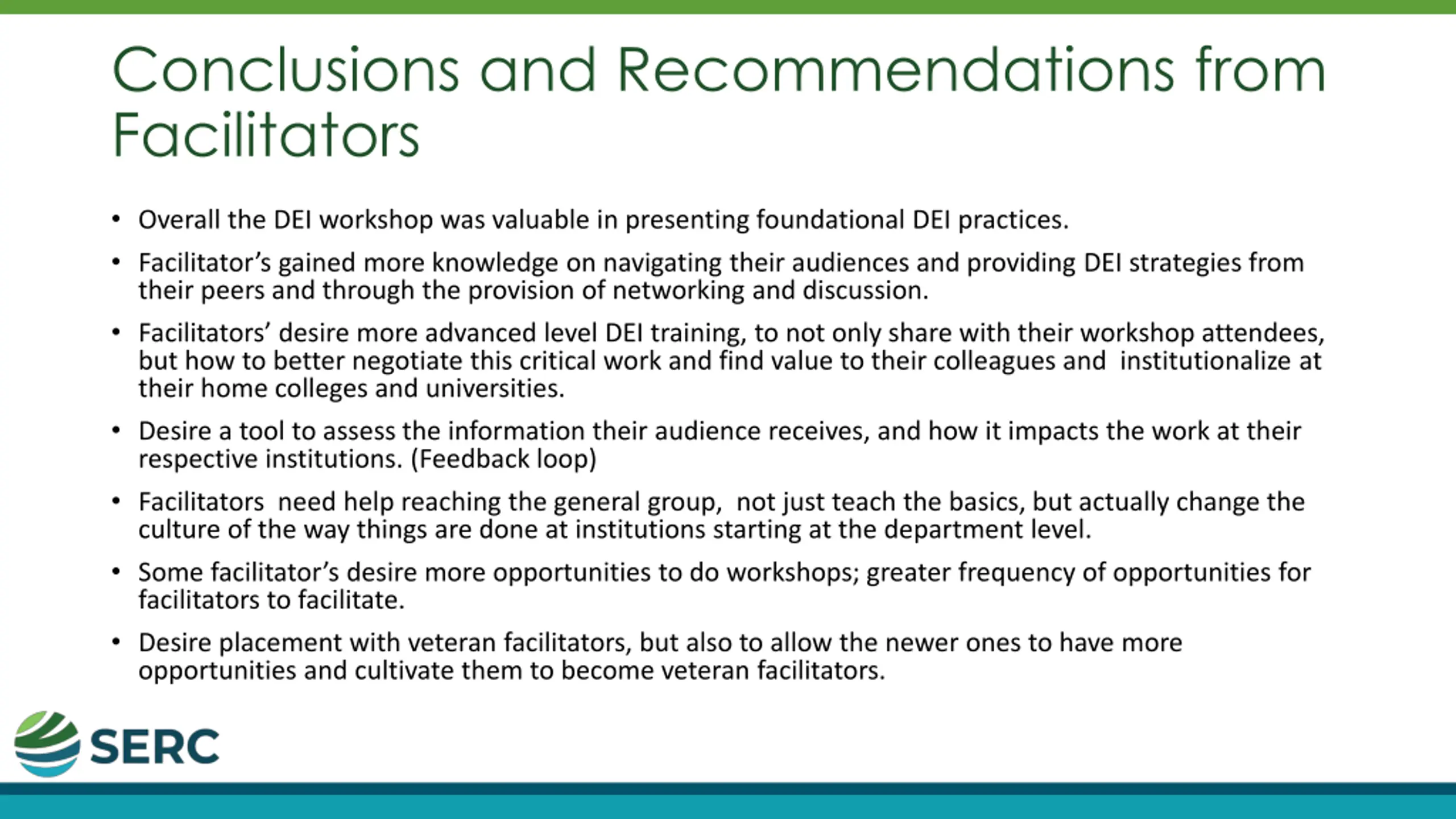 Conclusions and Recommendations from Facilitators Overall the DEI workshop was valuable in presenting foundational DEI practices. Facilitator s gained more knowledge on navigating their audiences and providing DEI strategies from their peers and through the provision of networking and discussion. Facilitators desire more advanced level DEI training, to not only share with their workshop attendees, but how to better negotiate this critical work and find value to their colleagues and institutionalize at their home colleges and universities. Desire a tool to assess the information their audience receives, and how it impacts the work at their respective institutions. (Feedback loop) Facilitators need help reaching the general group, not just teach the basics, but actually change the culture of the way things are done at institutions starting at the department level. Some facilitator s desire more opportunities to do workshops; greater frequency of opportunities for facilitators to facilitate. Desire placement with veteran facilitators, but also to allow the newer ones to have more opportunities and cultivate them to become veteran facilitators.
