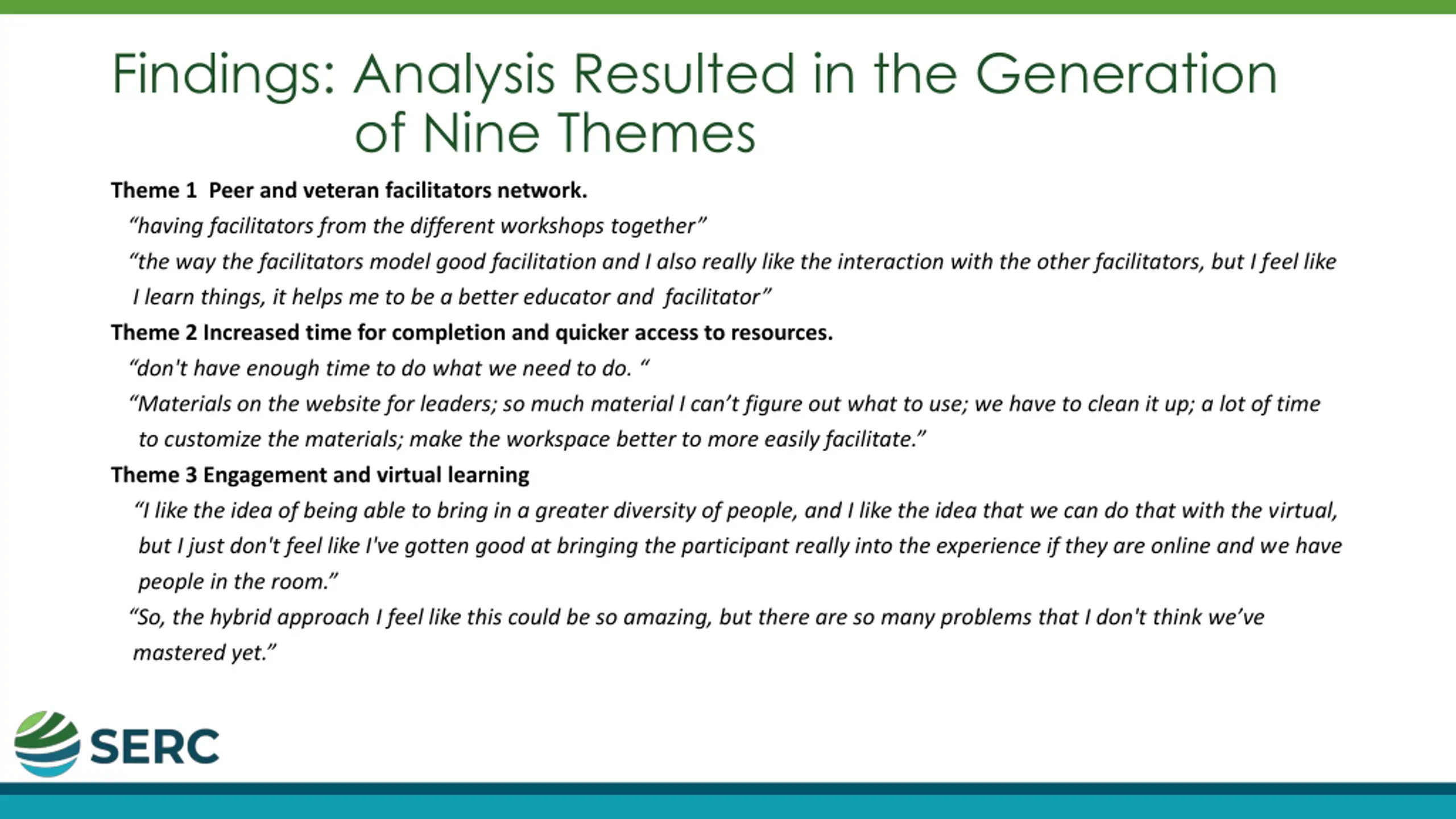 Findings: Analysis Resulted in the Generation of Nine Themes Theme 1 Peer and veteran facilitators network. having facilitators from the different workshops together the way the facilitators model good facilitation and I also really like the interaction with the other facilitators, but I feel like I learn things, it helps me to be a better educator and facilitator Theme 2 Increased time for completion and quicker access to resources. don't have enough time to do what we need to do. Materials on the website for leaders; so much material I can t figure out what to use; we have to clean it up; a lot of time to customize the materials; make the workspace better to more easily facilitate. Theme 3 Engagement and virtual learning I like the idea of being able to bring in a greater diversity of people, and I like the idea that we can do that with the virtual, but I just don't feel like I've gotten good at bringing the participant really into the experience if they are online and we have people in the room. So, the hybrid approach I feel like this could be so amazing, but there are so many problems that I don't think we ve mastered yet.