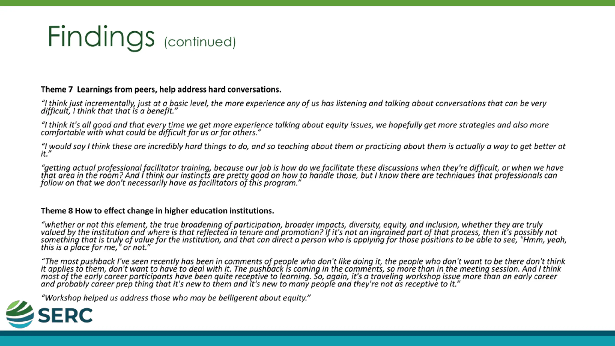 Findings (continued) Theme 7 Learnings from peers, help address hard conversations. I think just incrementally, just at a basic level, the more experience any of us has listening and talking about conversations that can be very difficult, I think that that is a benefit. I think it's all good and that every time we get more experience talking about equity issues, we hopefully get more strategies and also more comfortable with what could be difficult for us or for others. I would say I think these are incredibly hard things to do, and so teaching about them or practicing about them is actually a way to get better at it. getting actual professional facilitator training, because our job is how do we facilitate these discussions when they're difficult, or when we have that area in the room? And I think our instincts are pretty good on how to handle those, but I know there are techniques that professionals can follow on that we don't necessarily have as facilitators of this program. Theme 8 How to effect change in higher education institutions. whether or not this element, the true broadening of participation, broader impacts, diversity, equity, and inclusion, whether they are truly valued by the institution and where is that reflected in tenure and promotion? If it's not an ingrained part of that process, then it's possibly not something that is truly of value for the institution, and that can direct a person who is applying for those positions to be able to see, "Hmm, yeah, this is a place for me," or not. The most pushback I've seen recently has been in comments of people who don't like doing it, the people who don't want to be there don't think it applies to them, don't want to have to deal with it. The pushback is coming in the comments, so more than in the meeting session. And I think most of the early career participants have been quite receptive to learning. So, again, it's a traveling workshop issue more than an early career and probably career prep thing that it's new to them and it's new to many people and they're not as receptive to it. Workshop helped us address those who may be belligerent about equity.
