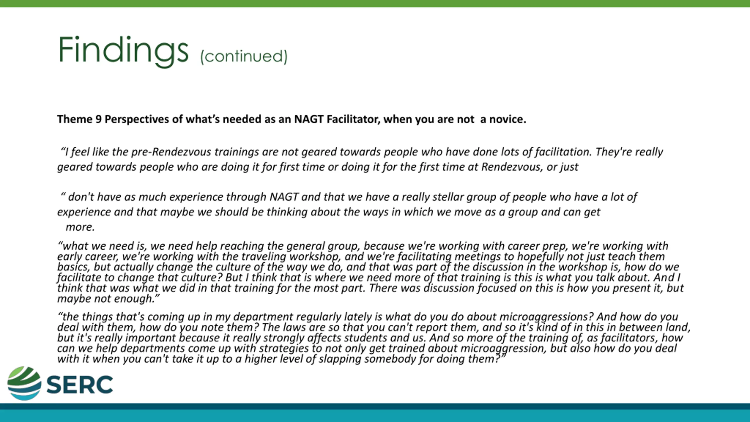 Findings (continued) Theme 9 Perspectives of what s needed as an NAGT Facilitator, when you are not a novice. I feel like the pre-Rendezvous trainings are not geared towards people who have done lots of facilitation. They're really geared towards people who are doing it for first time or doing it for the first time at Rendezvous, or just don't have as much experience through NAGT and that we have a really stellar group of people who have a lot of experience and that maybe we should be thinking about the ways in which we move as a group and can get more. what we need is, we need help reaching the general group, because we're working with career prep, we're working with early career, we're working with the traveling workshop, and we're facilitating meetings to hopefully not just teach them basics, but actually change the culture of the way we do, and that was part of the discussion in the workshop is, how do we facilitate to change that culture? But I think that is where we need more of that training is this is what you talk about. And I think that was what we did in that training for the most part. There was discussion focused on this is how you present it, but maybe not enough. the things that's coming up in my department regularly lately is what do you do about microaggressions? And how do you deal with them, how do you note them? The laws are so that you can't report them, and so it's kind of in this in between land, but it's really important because it really strongly affects students and us. And so more of the training of, as facilitators, how can we help departments come up with strategies to not only get trained about microaggression, but also how do you deal with it when you can't take it up to a higher level of slapping somebody for doing them?