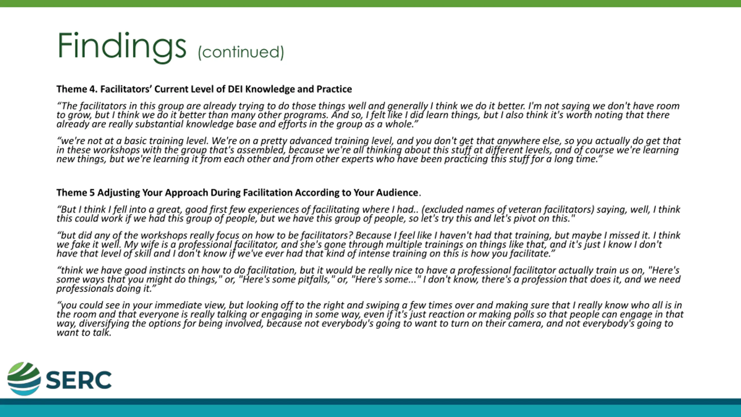 Findings (continued) Theme 4. Facilitators Current Level of DEI Knowledge and Practice The facilitators in this group are already trying to do those things well and generally I think we do it better. I'm not saying we don't have room to grow, but I think we do it better than many other programs. And so, I felt like I did learn things, but I also think it's worth noting that there already are really substantial knowledge base and efforts in the group as a whole. we're not at a basic training level. We're on a pretty advanced training level, and you don't get that anywhere else, so you actually do get that in these workshops with the group that's assembled, because we're all thinking about this stuff at different levels, and of course we're learning new things, but we're learning it from each other and from other experts who have been practicing this stuff for a long time. Theme 5 Adjusting Your Approach During Facilitation According to Your Audience. But I think I fell into a great, good first few experiences of facilitating where I had.. (excluded names of veteran facilitators) saying, well, I think this could work if we had this group of people, but we have this group of people, so let's try this and let's pivot on this." but did any of the workshops really focus on how to be facilitators? Because I feel like I haven't had that training, but maybe I missed it. I think we fake it well. My wife is a professional facilitator, and she's gone through multiple trainings on things like that, and it's just I know I don't have that level of skill and I don't know if we've ever had that kind of intense training on this is how you facilitate. think we have good instincts on how to do facilitation, but it would be really nice to have a professional facilitator actually train us on, "Here's some ways that you might do things," or, "Here's some pitfalls," or, "Here's some..." I don't know, there's a profession that does it, and we need professionals doing it. you could see in your immediate view, but looking off to the right and swiping a few times over and making sure that I really know who all is in the room and that everyone is really talking or engaging in some way, even if it's just reaction or making polls so that people can engage in that way, diversifying the options for being involved, because not everybody's going to want to turn on their camera, and not everybody's going to want to talk.