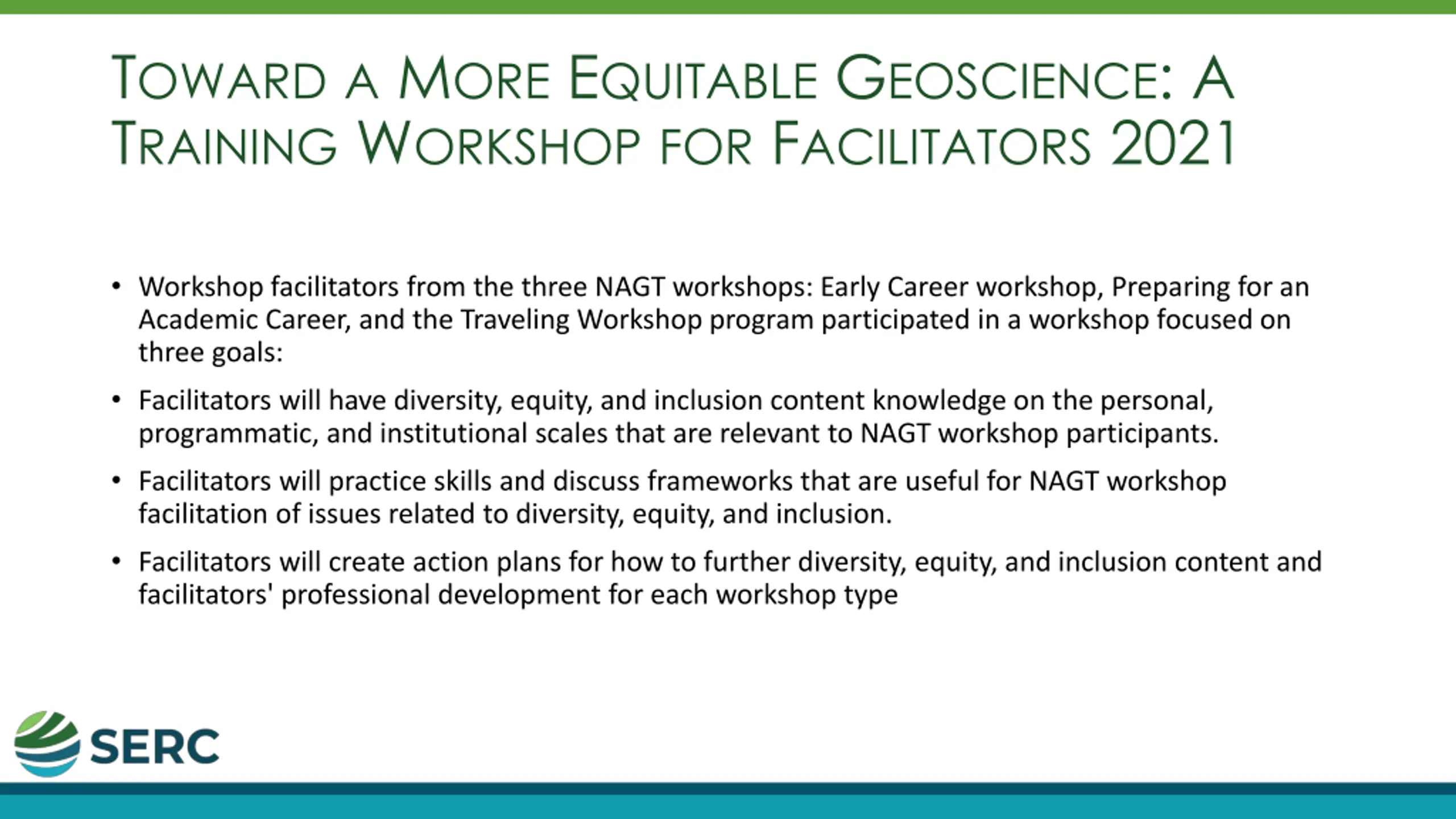TOWARDA MORE EQUITABLE GEOSCIENCE: A TRAINING WORKSHOPFOR FACILITATORS 2021 Workshop facilitators from the three NAGT workshops: Early Career workshop, Preparing for an Academic Career, and the Traveling Workshop program participated in a workshop focused on three goals: Facilitators will have diversity, equity, and inclusion content knowledge on the personal, programmatic, and institutional scales that are relevant to NAGT workshop participants. Facilitators will practice skills and discuss frameworks that are useful for NAGT workshop facilitation of issues related to diversity, equity, and inclusion. Facilitators will create action plans for how to further diversity, equity, and inclusion content and facilitators' professional development for each workshop type
