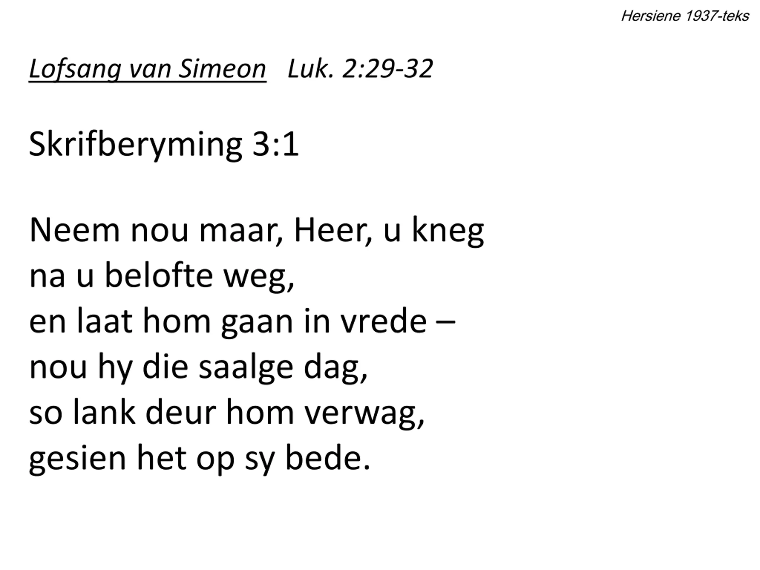 Hersiene 1937-teks Lofsang van Simeon Luk. 2:29-32 Skrifberyming 3:1 Neem nou maar, Heer, u kneg na u belofte weg, en laat hom gaan in vrede nou hy die saalge dag, so lank deur hom verwag, gesien het op sy bede.