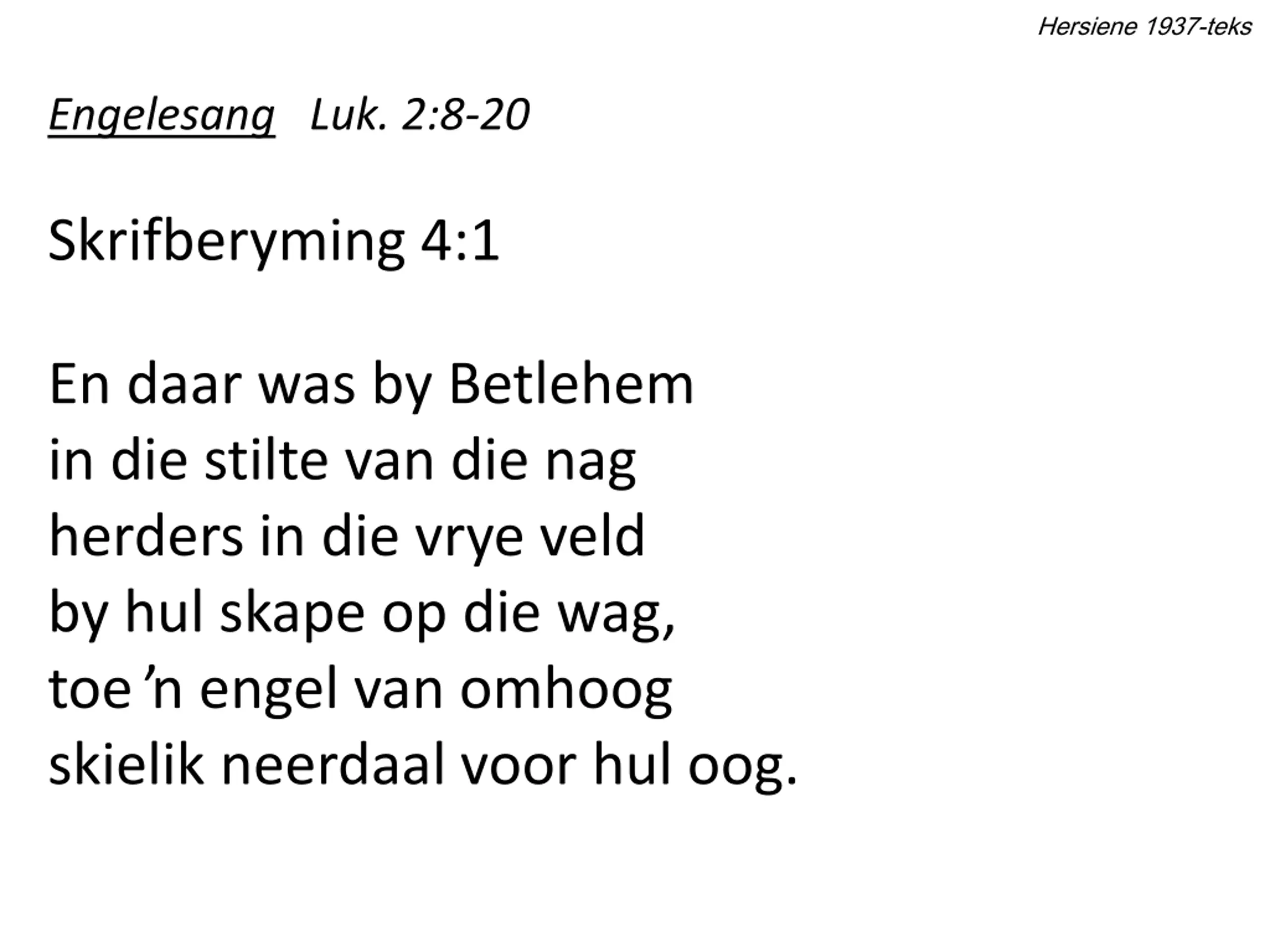 Hersiene 1937-teks Engelesang Luk. 2:8-20 Skrifberyming 4:1 En daar was by Betlehem in die stilte van die nag herders in die vrye veld by hul skape op die wag, toe engel van omhoog skielik neerdaal voor hul oog.