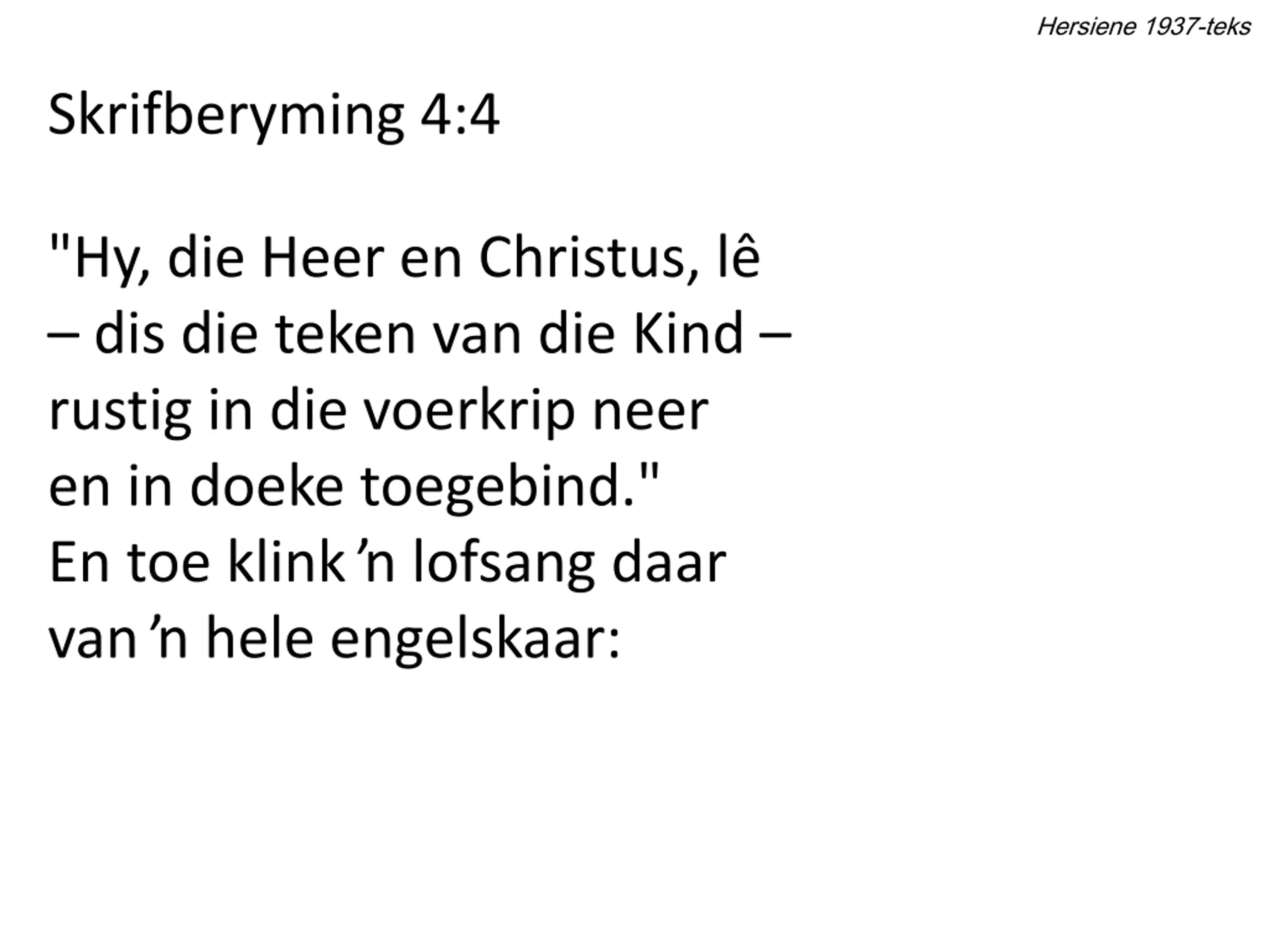 Hersiene 1937-teks Skrifberyming 4:4 "Hy, die Heer en Christus, l dis die teken van die Kind rustig in die voerkrip neer en in doeke toegebind." En toe klink lofsang daar van hele engelskaar: