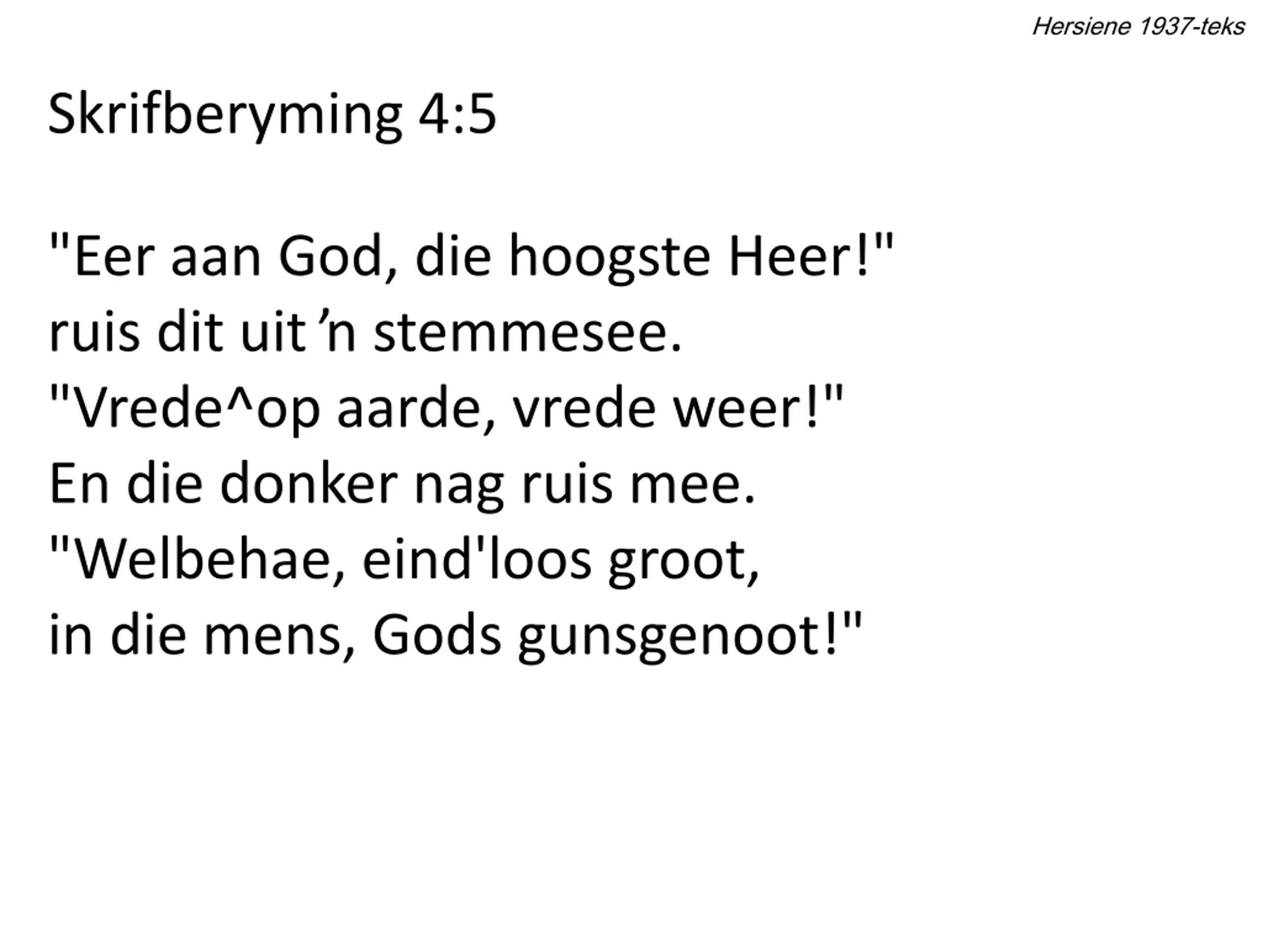 Hersiene 1937-teks Skrifberyming 4:5 "Eer aan God, die hoogste Heer!" ruis dit uit stemmesee. "Vrede^op aarde, vrede weer!" En die donker nag ruis mee. "Welbehae, eind'loos groot, in die mens, Gods gunsgenoot!"