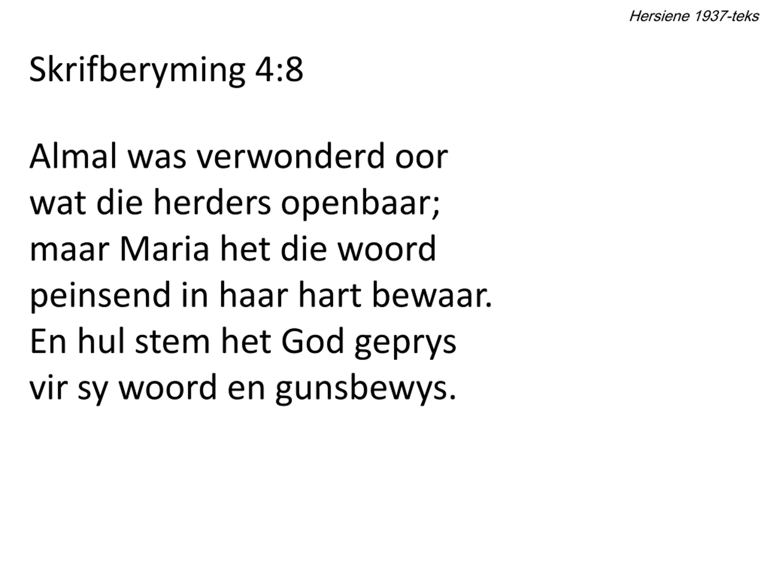 Hersiene 1937-teks Skrifberyming 4:8 Almal was verwonderd oor wat die herders openbaar; maar Maria het die woord peinsend in haar hart bewaar. En hul stem het God geprys vir sy woord en gunsbewys.