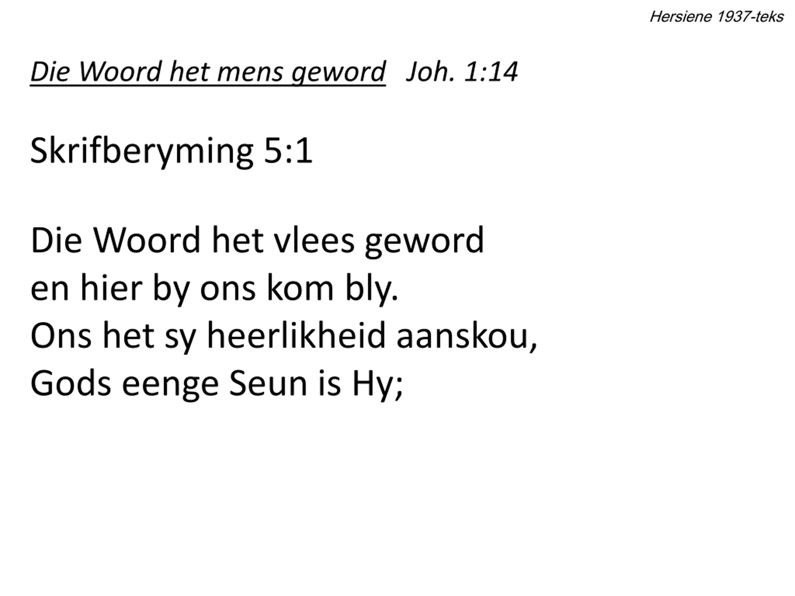 Hersiene 1937-teks Die Woord het mens geword Joh. 1:14 Skrifberyming 5:1 Die Woord het vlees geword en hier by ons kom bly. Ons het sy heerlikheid aanskou, Gods eenge Seun is Hy;