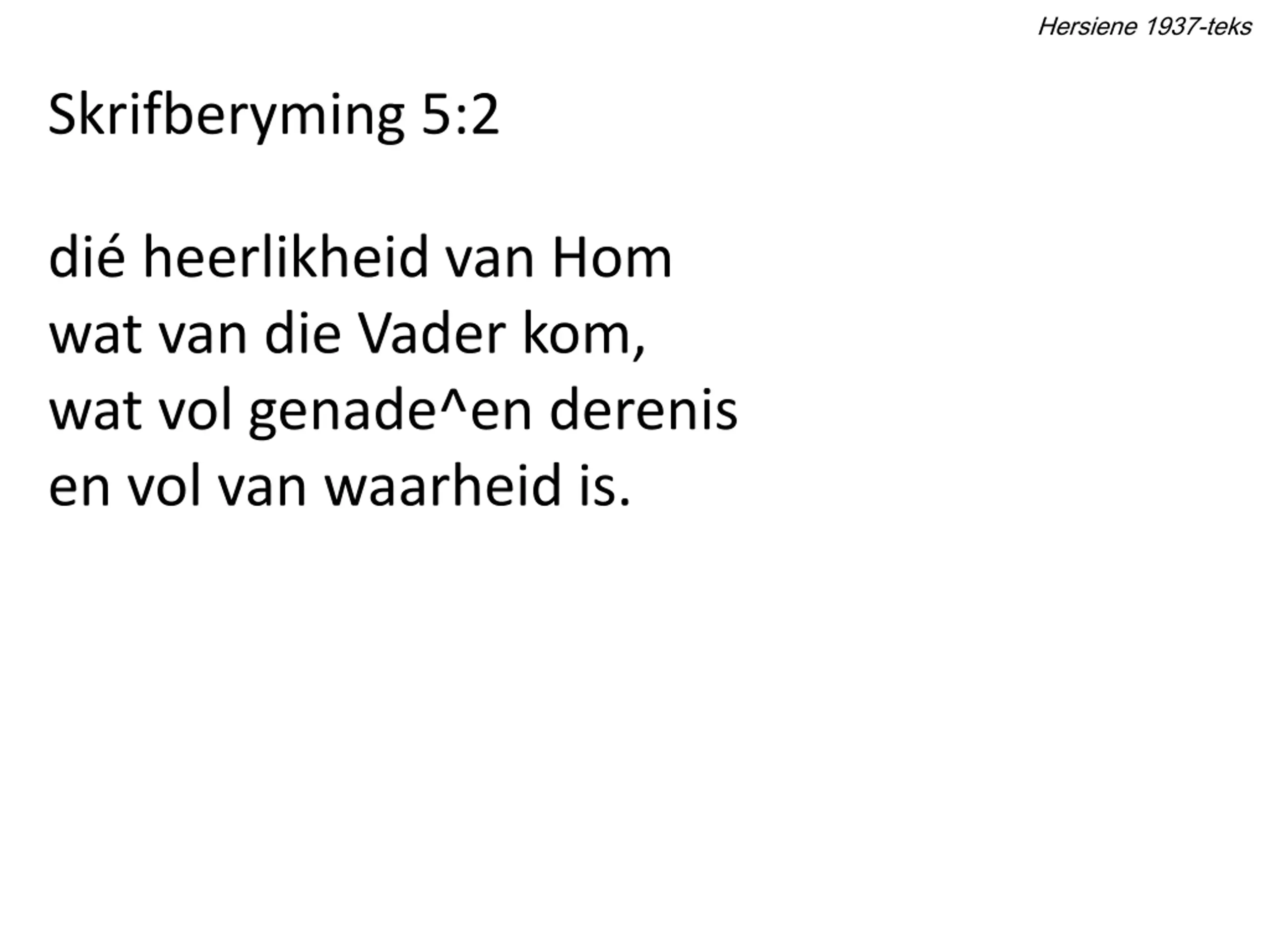 Hersiene 1937-teks Skrifberyming 5:2 di heerlikheid van Hom wat van die Vader kom, wat vol genade^en derenis en vol van waarheid is.