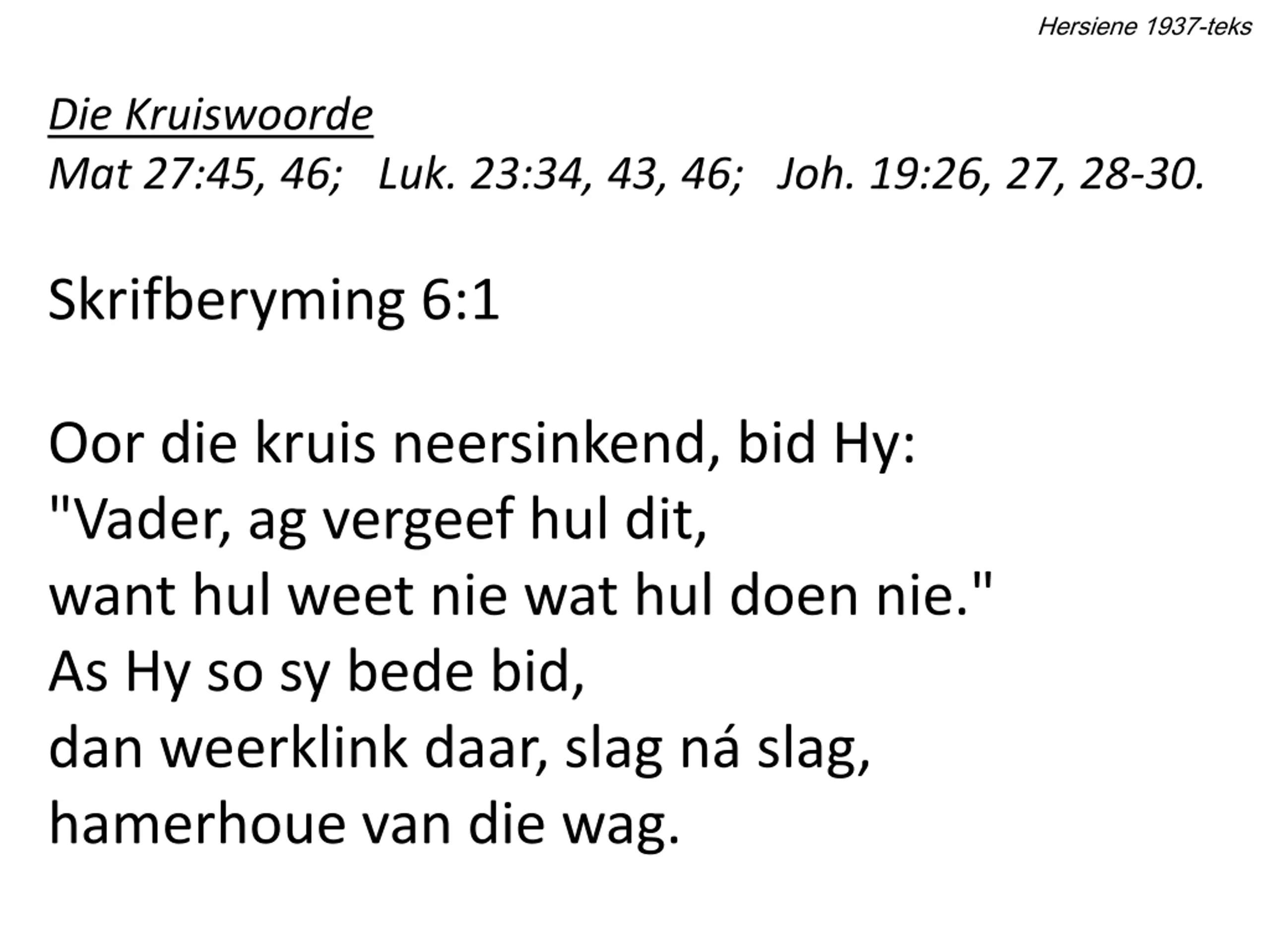 Hersiene 1937-teks Die Kruiswoorde Mat 27:45, 46; Luk. 23:34, 43, 46; Joh. 19:26, 27, 28-30. Skrifberyming 6:1 Oor die kruis neersinkend, bid Hy: "Vader, ag vergeef hul dit, want hul weet nie wat hul doen nie." As Hy so sy bede bid, dan weerklink daar, slag n slag, hamerhoue van die wag.