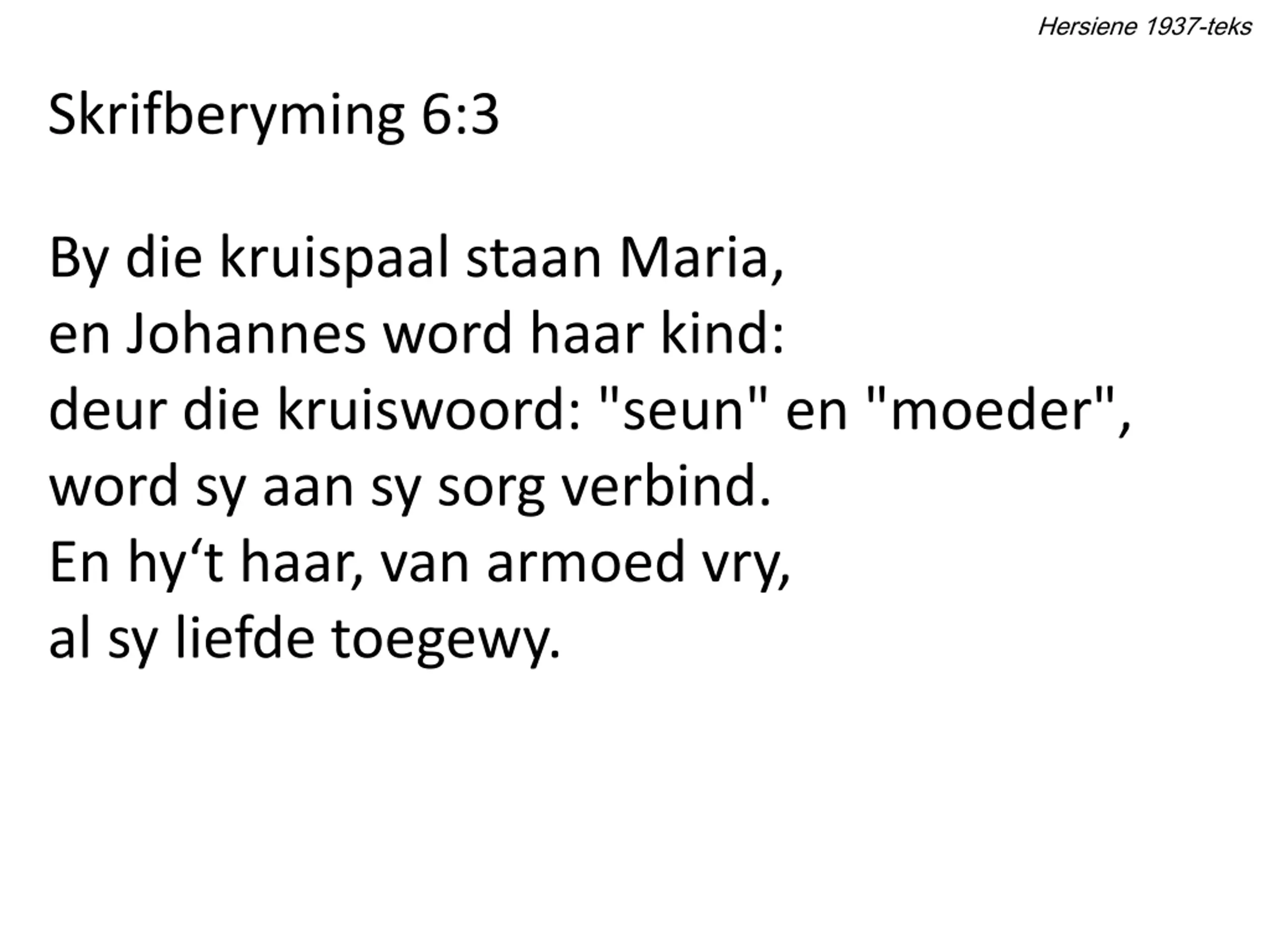 Hersiene 1937-teks Skrifberyming 6:3 By die kruispaal staan Maria, en Johannes word haar kind: deur die kruiswoord: "seun" en "moeder", word sy aan sy sorg verbind. En hy t haar, van armoed vry, al sy liefde toegewy.