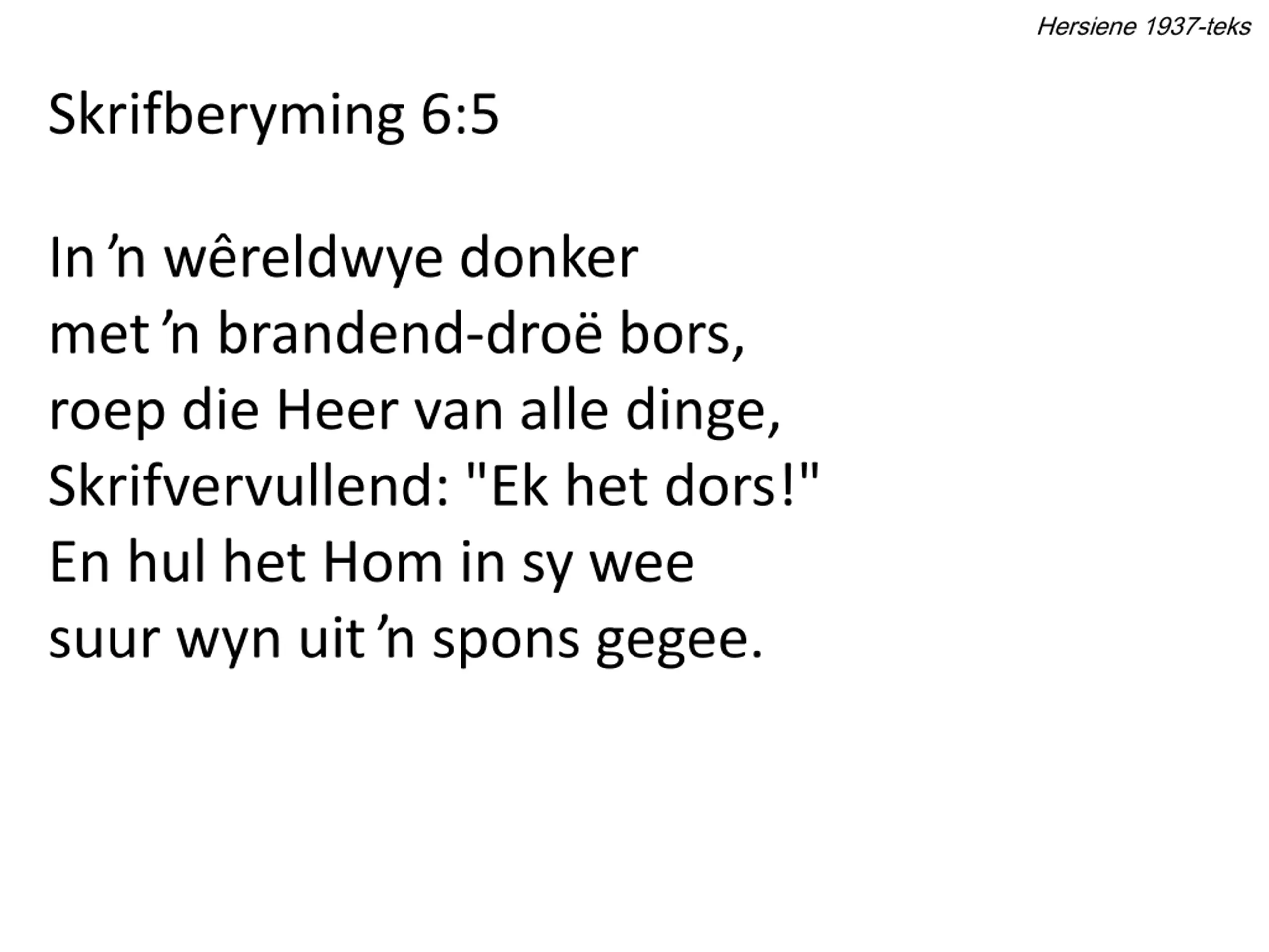 Hersiene 1937-teks Skrifberyming 6:5 In w reldwye donker met brandend-dro bors, roep die Heer van alle dinge, Skrifvervullend: "Ek het dors!" En hul het Hom in sy wee suur wyn uit spons gegee.