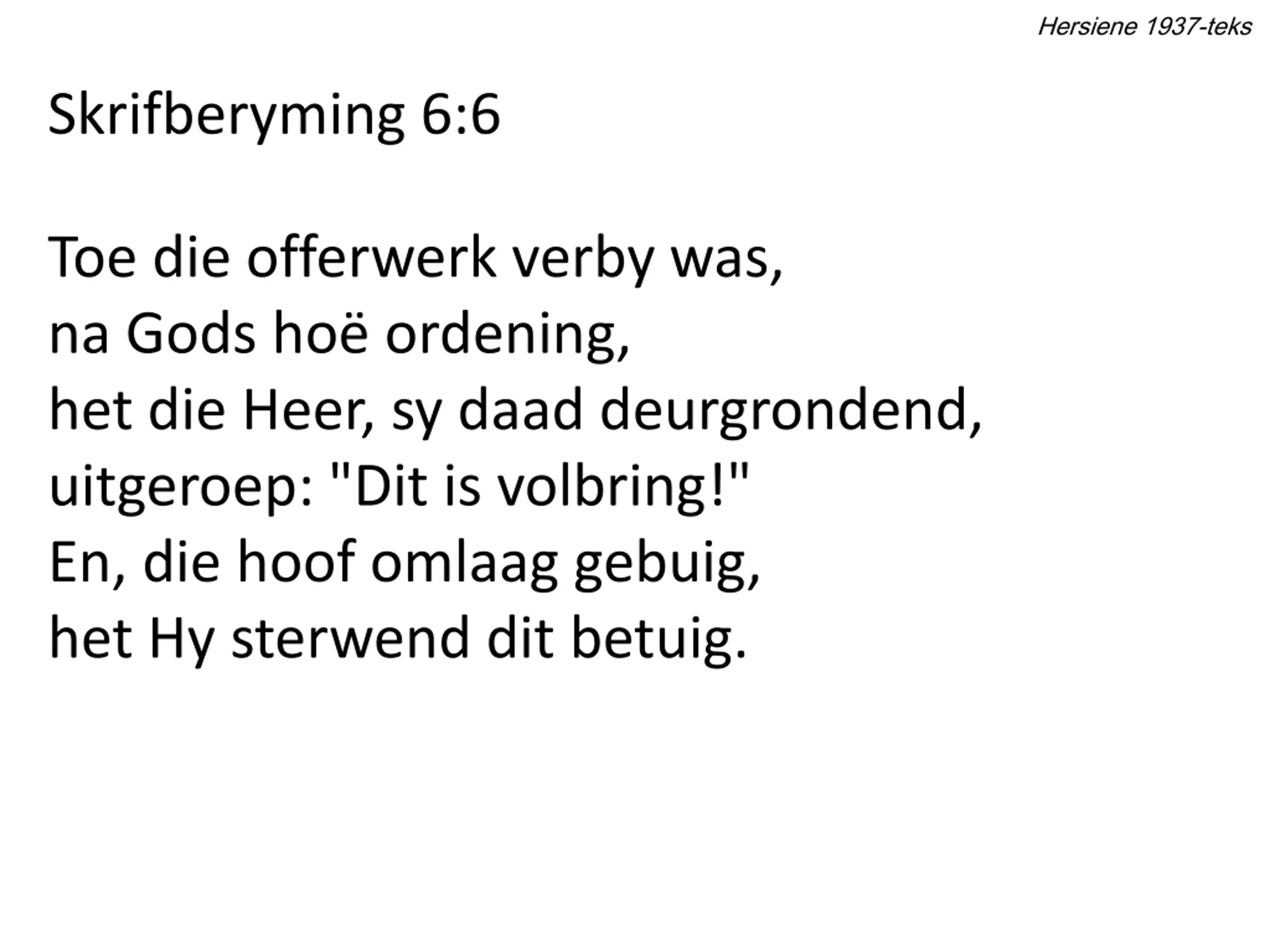 Hersiene 1937-teks Skrifberyming 6:6 Toe die offerwerk verby was, na Gods ho ordening, het die Heer, sy daad deurgrondend, uitgeroep: "Dit is volbring!" En, die hoof omlaag gebuig, het Hy sterwend dit betuig.