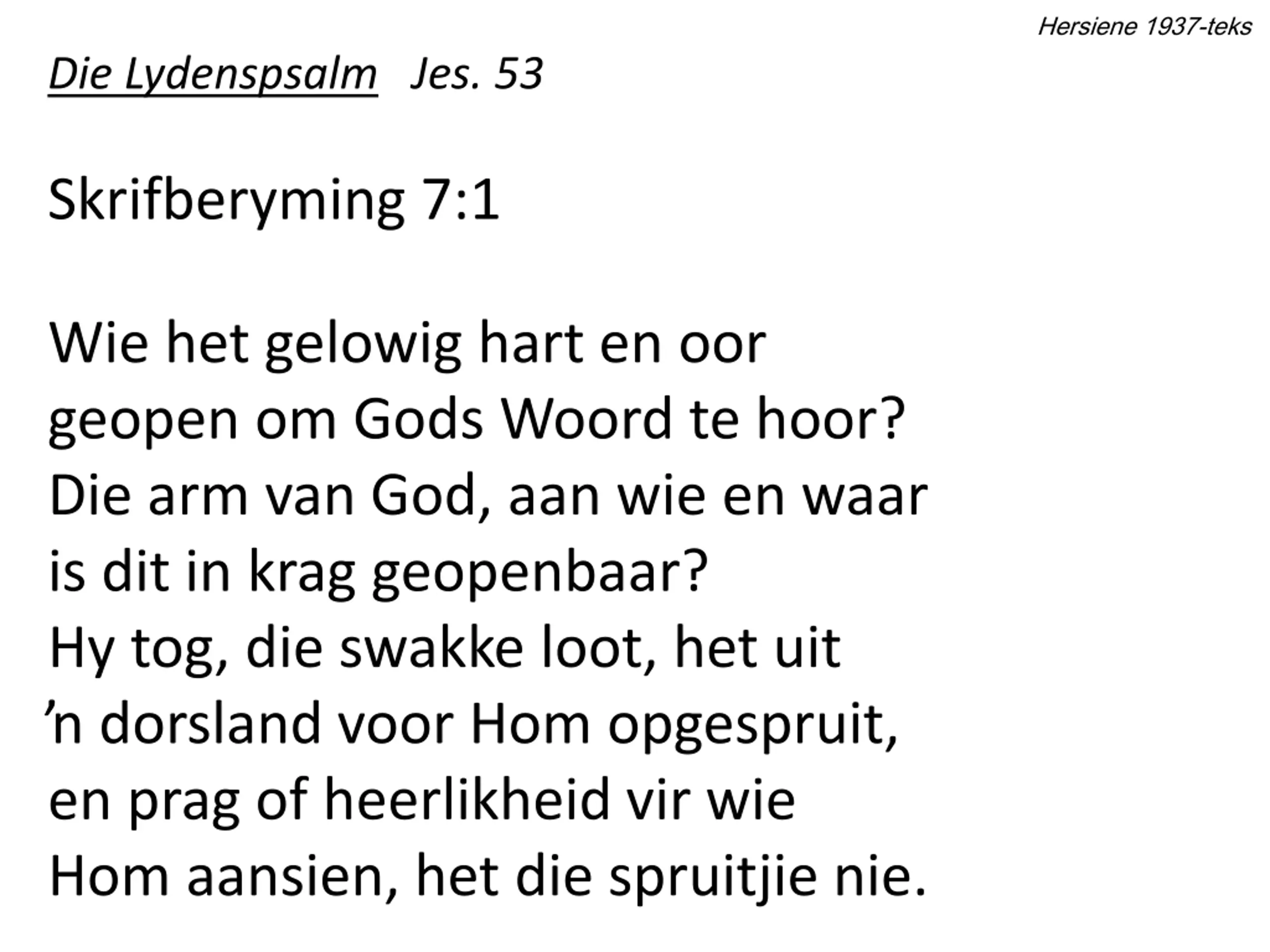 Hersiene 1937-teks Die Lydenspsalm Jes. 53 Skrifberyming 7:1 Wie het gelowig hart en oor geopen om Gods Woord te hoor? Die arm van God, aan wie en waar is dit in krag geopenbaar? Hy tog, die swakke loot, het uit dorsland voor Hom opgespruit, en prag of heerlikheid vir wie Hom aansien, het die spruitjie nie.
