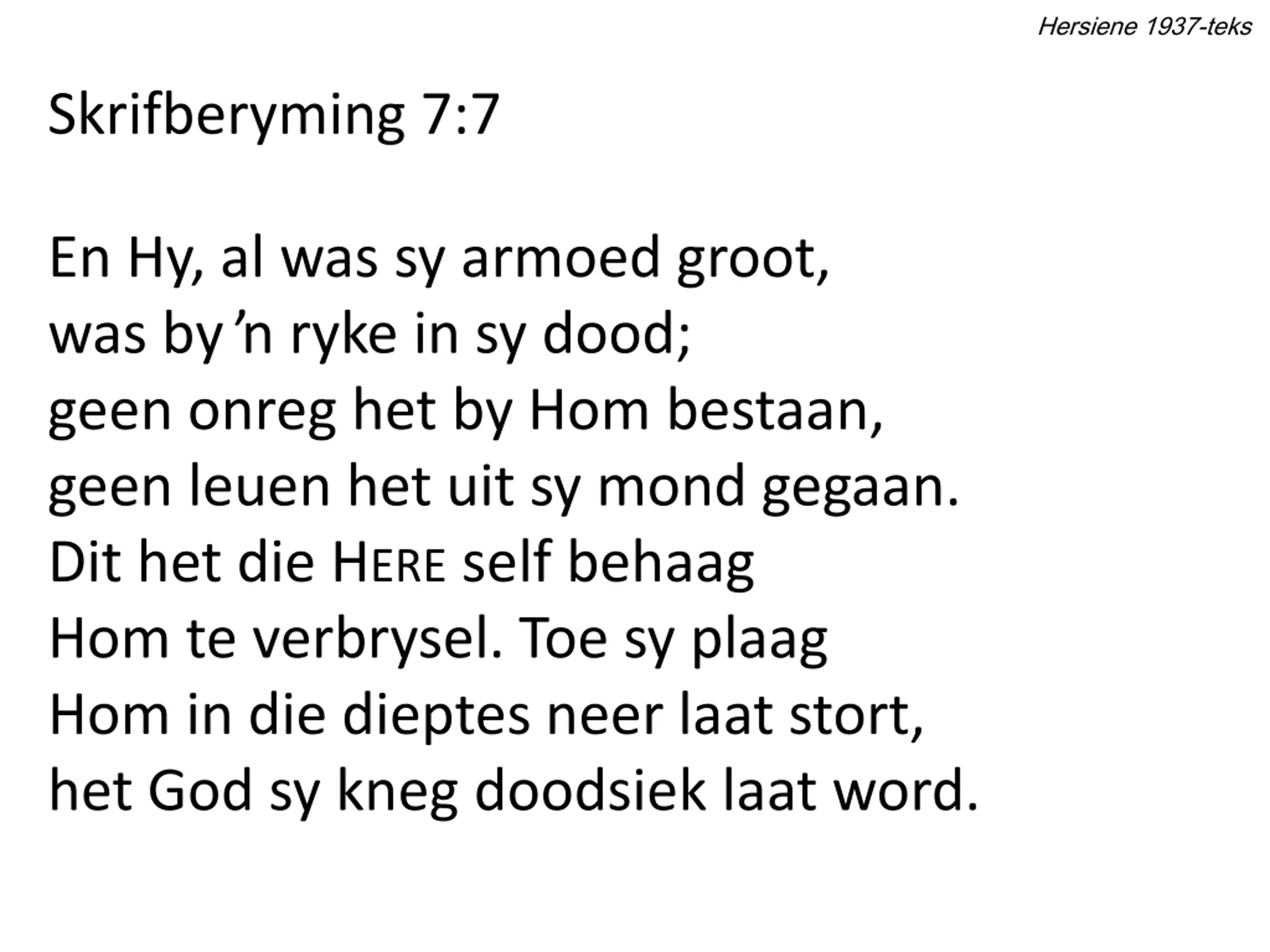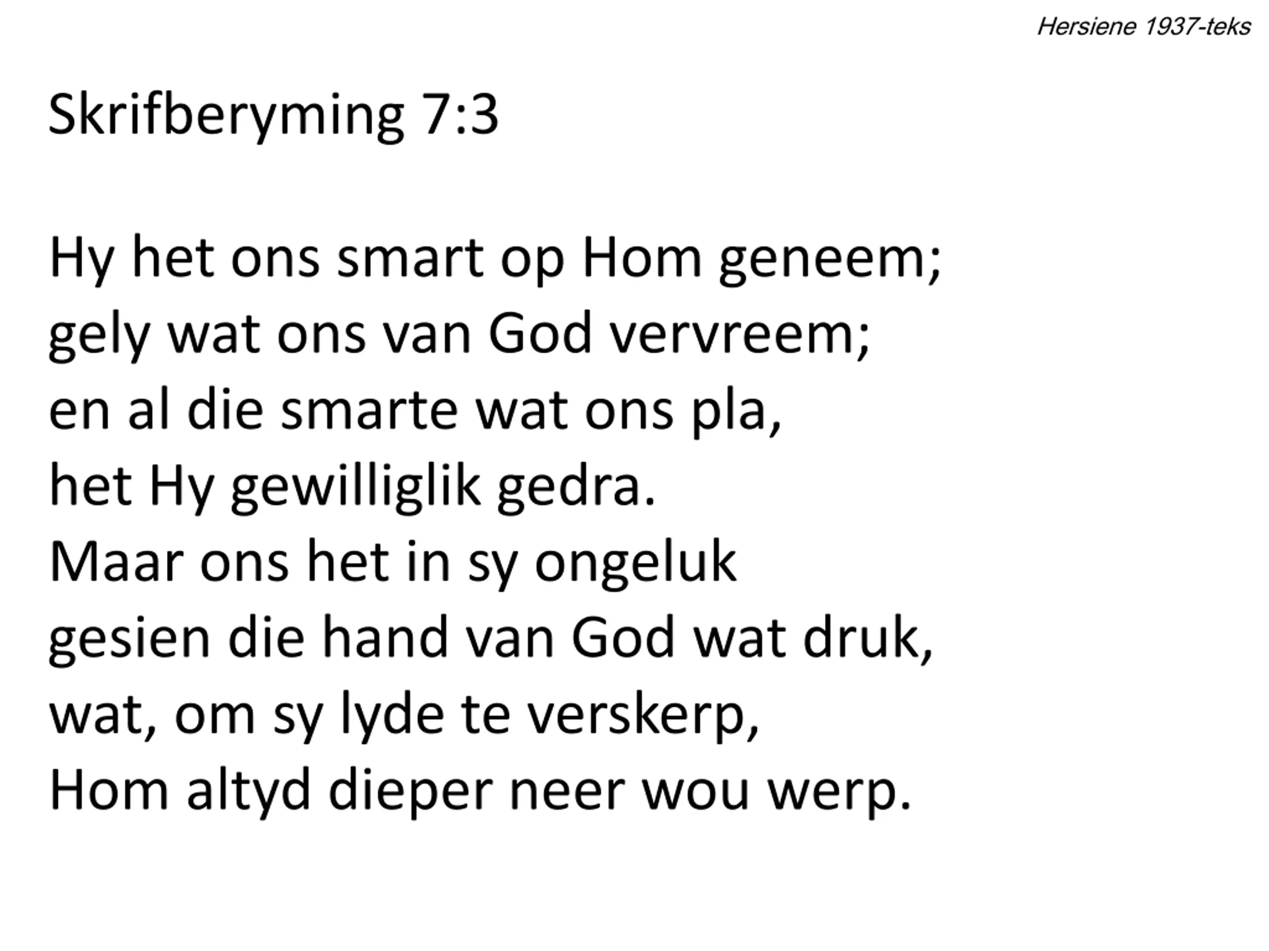 Hersiene 1937-teks Skrifberyming 7:2 Hoe sou ons Hom dan kon begeer?... Hy was verlate, onge er, vir almal net smarteman, die lydensnaar altyd gespan. Vir Hom, deur wreedste smart geterg, het ons die aangesig verberg; en in die bitter lydensnag het ons Hom in sy leed verag.