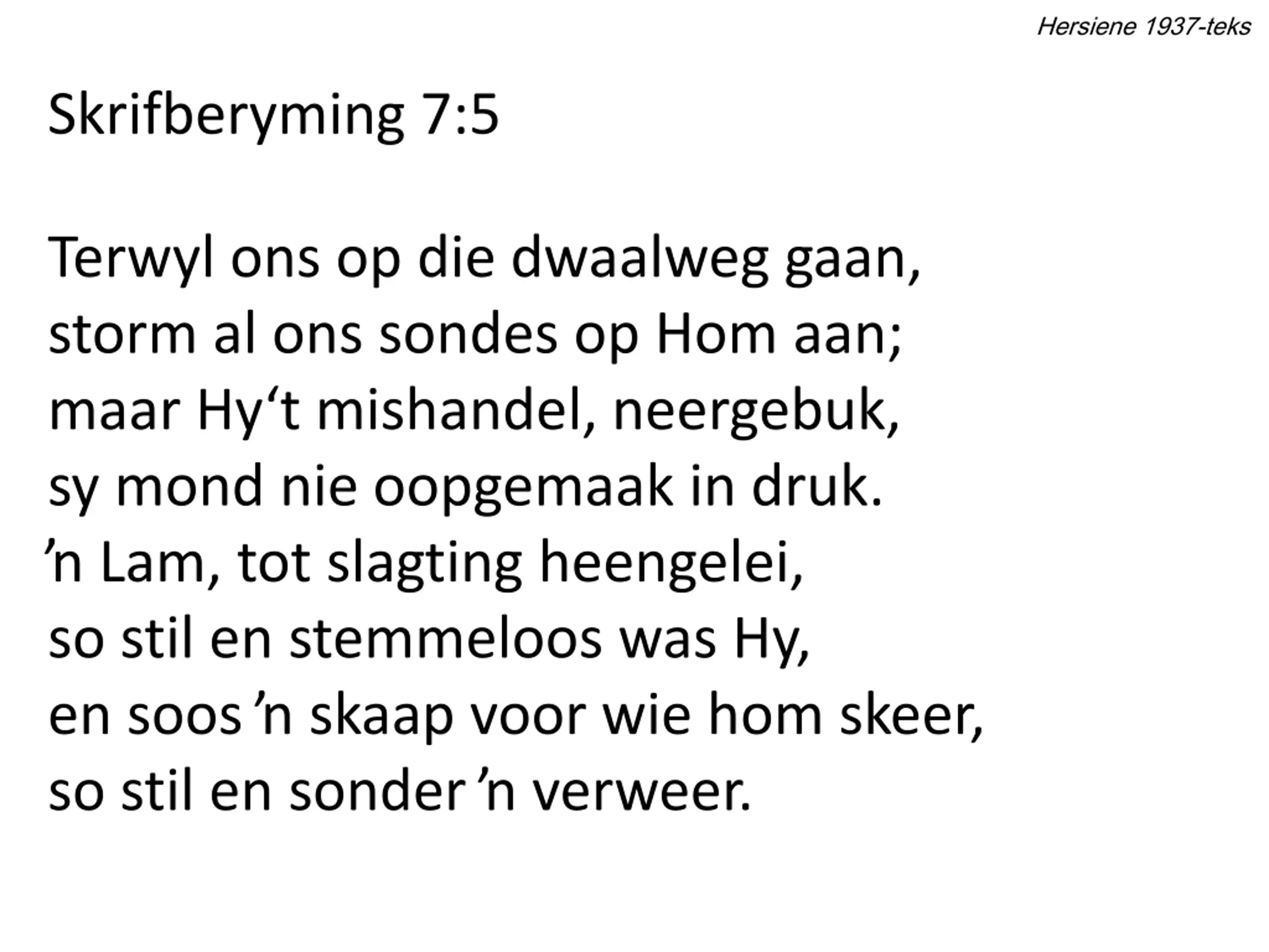 Hersiene 1937-teks Skrifberyming 7:5 Terwyl ons op die dwaalweg gaan, storm al ons sondes op Hom aan; maar Hy t mishandel, neergebuk, sy mond nie oopgemaak in druk. Lam, tot slagting heengelei, so stil en stemmeloos was Hy, en soos skaap voor wie hom skeer, so stil en sonder verweer.