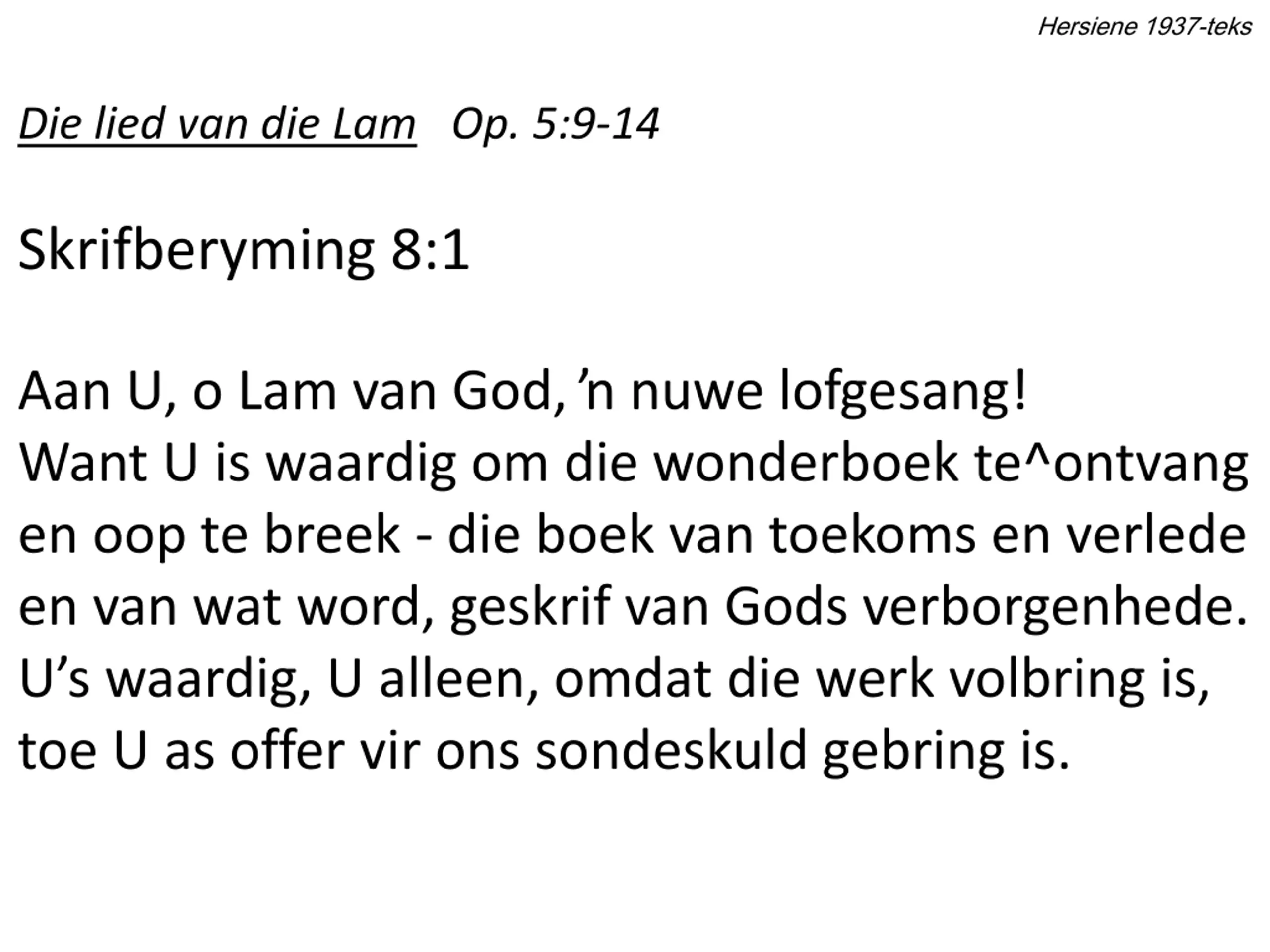 Hersiene 1937-teks Die lied van die Lam Op. 5:9-14 Skrifberyming 8:1 Aan U, o Lam van God, nuwe lofgesang! Want U is waardig om die wonderboek te^ontvang en oop te breek - die boek van toekoms en verlede en van wat word, geskrif van Gods verborgenhede. U s waardig, U alleen, omdat die werk volbring is, toe U as offer vir ons sondeskuld gebring is.