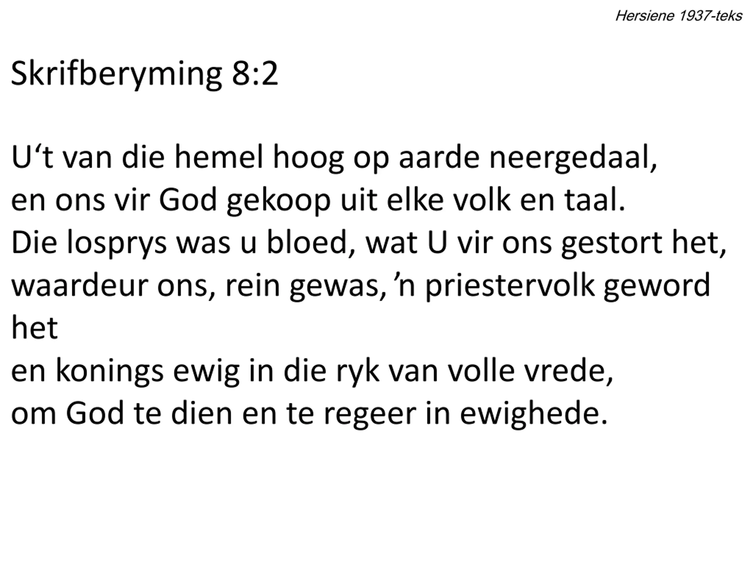 Hersiene 1937-teks Skrifberyming 8:2 U t van die hemel hoog op aarde neergedaal, en ons vir God gekoop uit elke volk en taal. Die losprys was u bloed, wat U vir ons gestort het, waardeur ons, rein gewas, priestervolk geword het en konings ewig in die ryk van volle vrede, om God te dien en te regeer in ewighede.