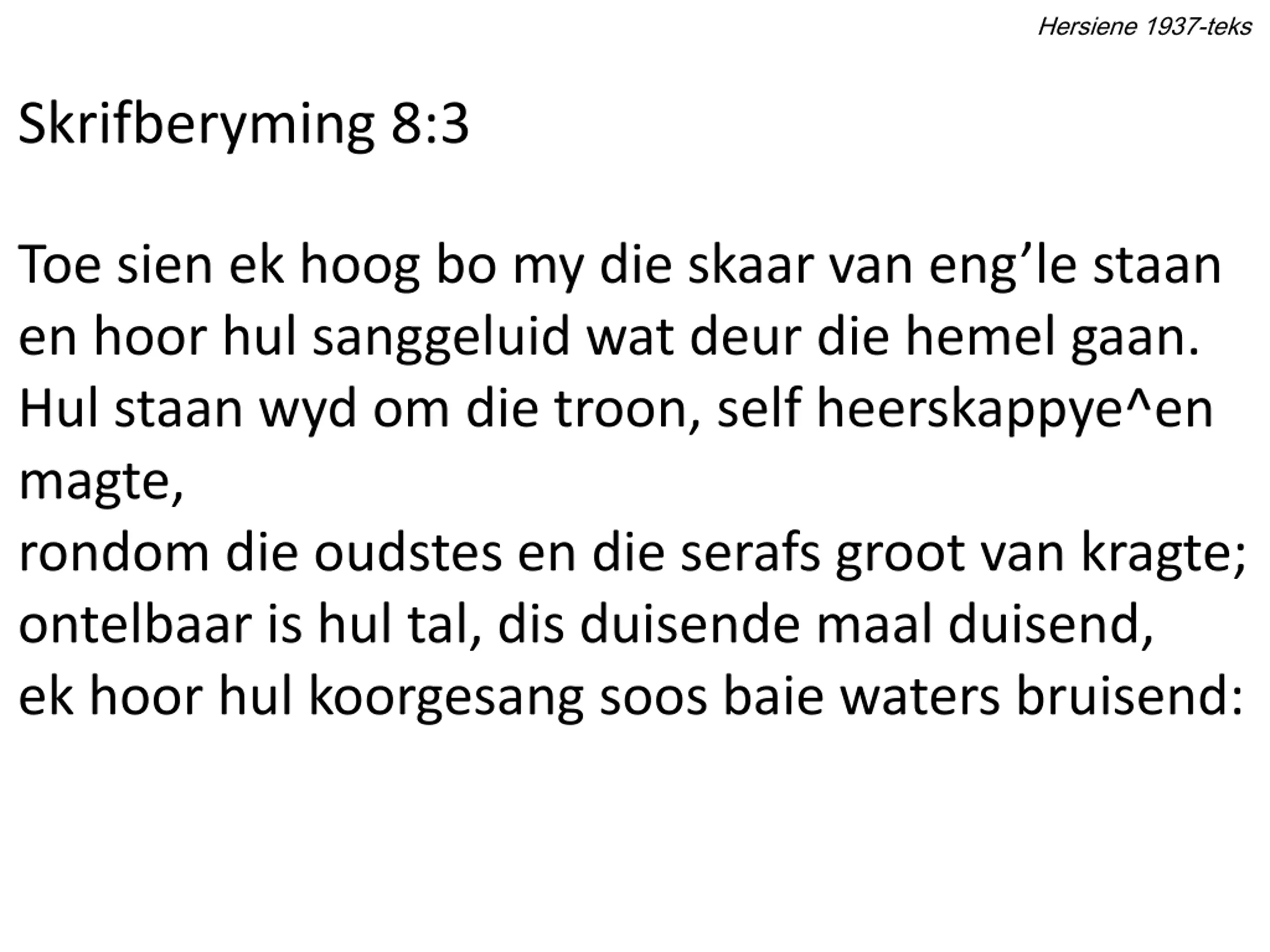 Hersiene 1937-teks Skrifberyming 8:3 Toe sien ek hoog bo my die skaar van eng le staan en hoor hul sanggeluid wat deur die hemel gaan. Hul staan wyd om die troon, self heerskappye^en magte, rondom die oudstes en die serafs groot van kragte; ontelbaar is hul tal, dis duisende maal duisend, ek hoor hul koorgesang soos baie waters bruisend: