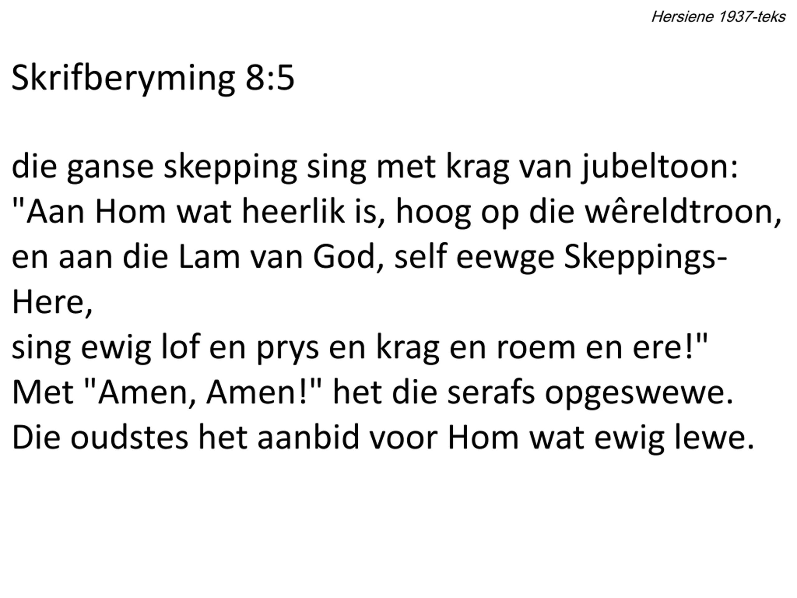 Hersiene 1937-teks Skrifberyming 8:5 die ganse skepping sing met krag van jubeltoon: "Aan Hom wat heerlik is, hoog op die w reldtroon, en aan die Lam van God, self eewge Skeppings- Here, sing ewig lof en prys en krag en roem en ere!" Met "Amen, Amen!" het die serafs opgeswewe. Die oudstes het aanbid voor Hom wat ewig lewe.