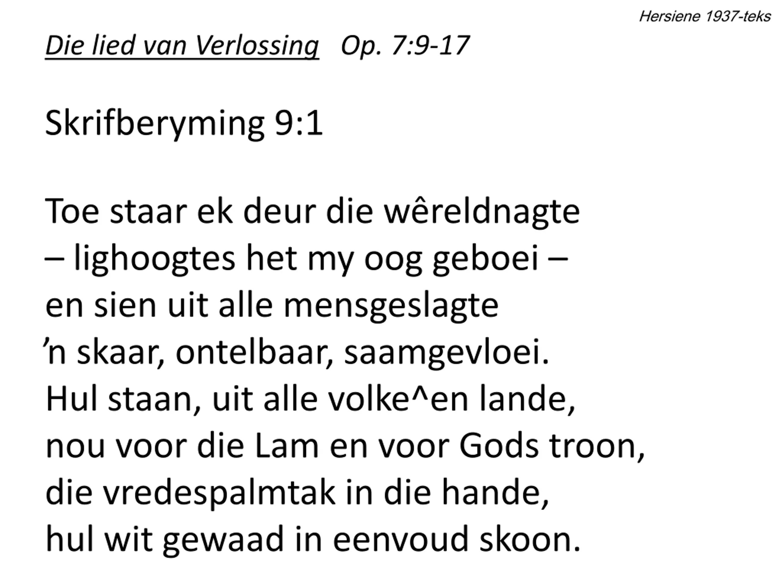 Hersiene 1937-teks Die lied van Verlossing Op. 7:9-17 Skrifberyming 9:1 Toe staar ek deur die w reldnagte lighoogtes het my oog geboei en sien uit alle mensgeslagte skaar, ontelbaar, saamgevloei. Hul staan, uit alle volke^en lande, nou voor die Lam en voor Gods troon, die vredespalmtak in die hande, hul wit gewaad in eenvoud skoon.