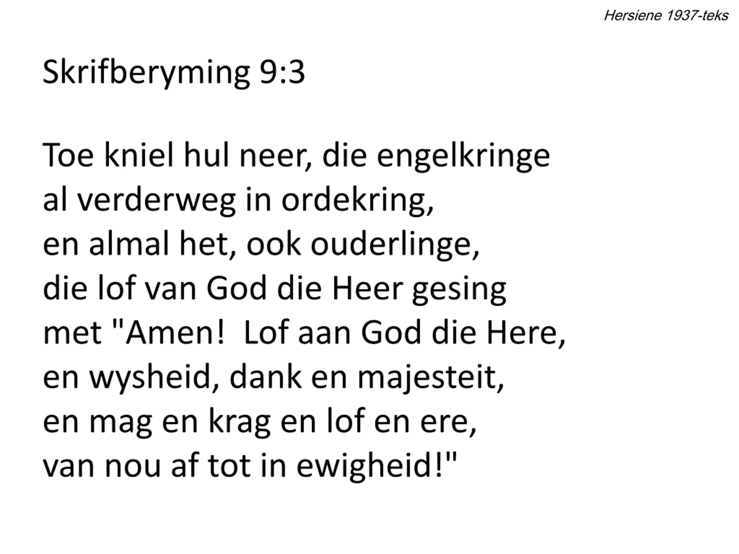 Hersiene 1937-teks Skrifberyming 9:3 Toe kniel hul neer, die engelkringe al verderweg in ordekring, en almal het, ook ouderlinge, die lof van God die Heer gesing met "Amen! Lof aan God die Here, en wysheid, dank en majesteit, en mag en krag en lof en ere, van nou af tot in ewigheid!"