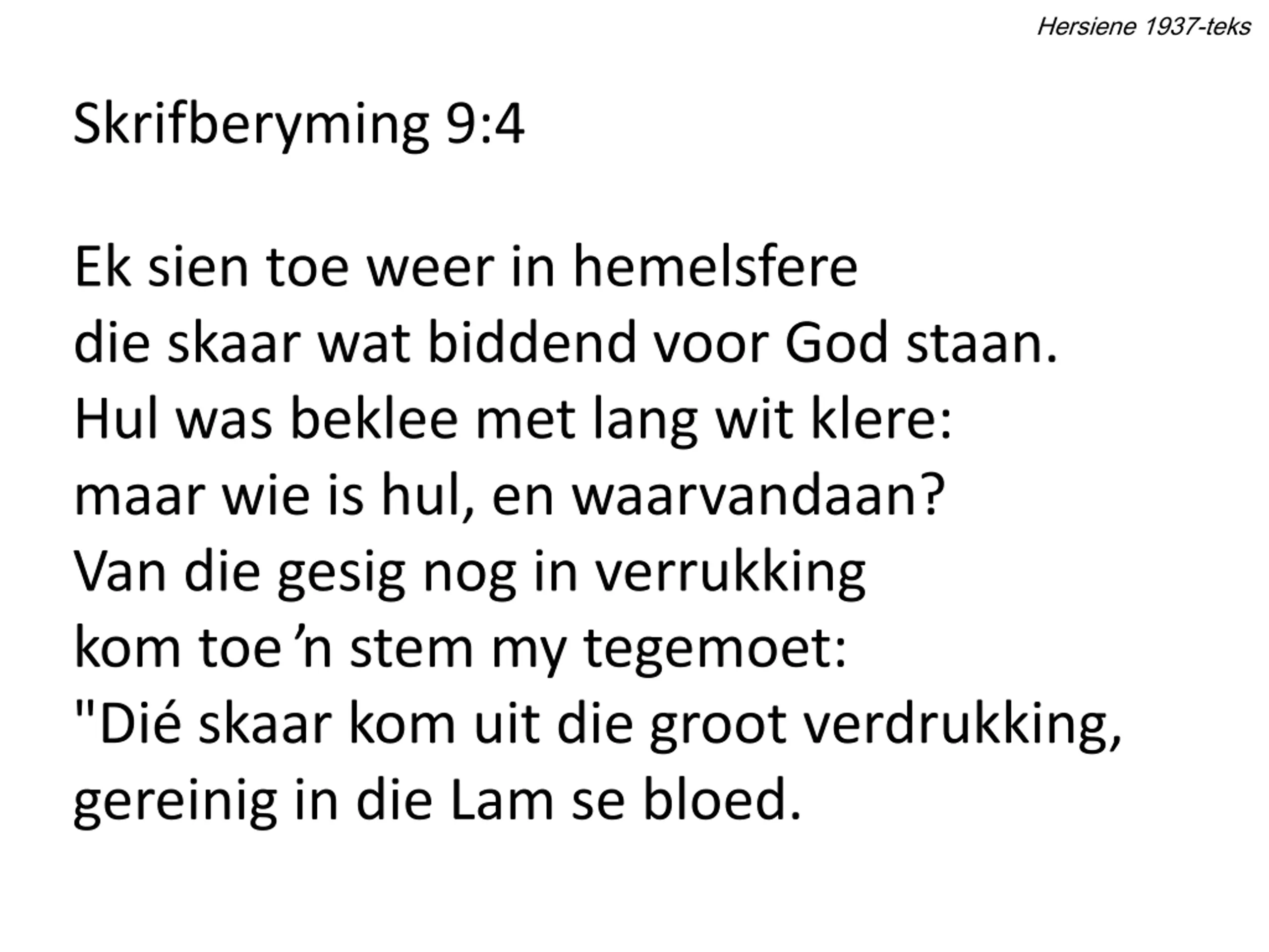 Hersiene 1937-teks Skrifberyming 9:4 Ek sien toe weer in hemelsfere die skaar wat biddend voor God staan. Hul was beklee met lang wit klere: maar wie is hul, en waarvandaan? Van die gesig nog in verrukking kom toe stem my tegemoet: "Di skaar kom uit die groot verdrukking, gereinig in die Lam se bloed.