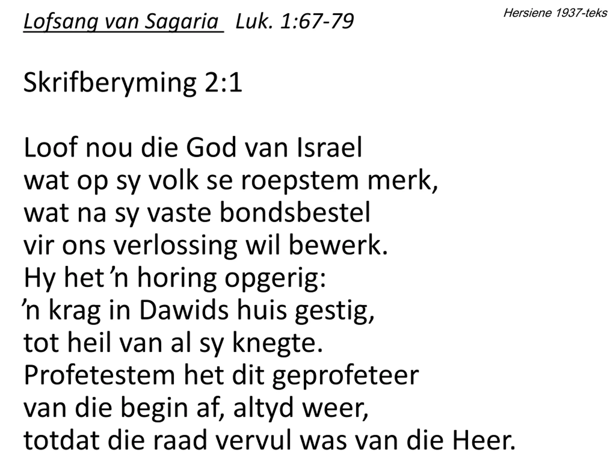 Hersiene 1937-teks Lofsang van Sagaria Luk. 1:67-79 Skrifberyming 2:1 Loof nou die God van Israel wat op sy volk se roepstem merk, wat na sy vaste bondsbestel vir ons verlossing wil bewerk. Hy het horing opgerig: krag in Dawids huis gestig, tot heil van al sy knegte. Profetestem het dit geprofeteer van die begin af, altyd weer, totdat die raad vervul was van die Heer.