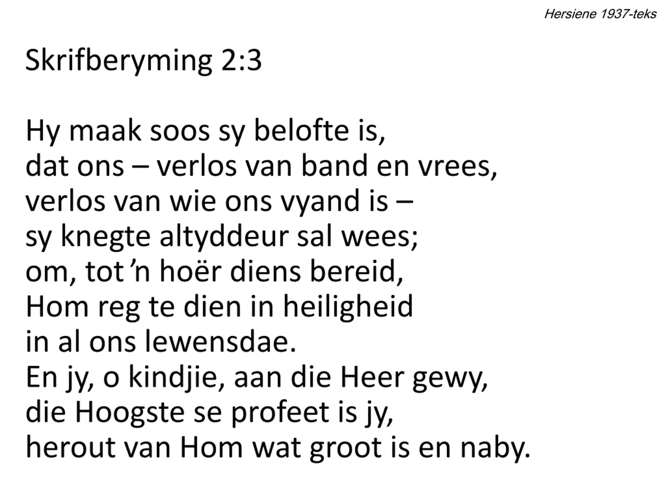 Hersiene 1937-teks Skrifberyming 2:3 Hy maak soos sy belofte is, dat ons verlos van band en vrees, verlos van wie ons vyand is sy knegte altyddeur sal wees; om, tot ho r diens bereid, Hom reg te dien in heiligheid in al ons lewensdae. En jy, o kindjie, aan die Heer gewy, die Hoogste se profeet is jy, herout van Hom wat groot is en naby.
